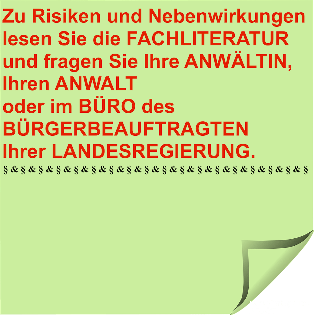 Ob dem so sein wird, wird die Zukunft zeigen.Nr. 280 Zu Risiken und Nebenwirkungen lesen Sie die FACHLITERATUR und fragen Sie Ihre ANWÄLTIN, Ihren ANWALT oder im BÜRO des BÜRGERBEAUFTRAGTEN Ihrer LANDESREGIERUNG.