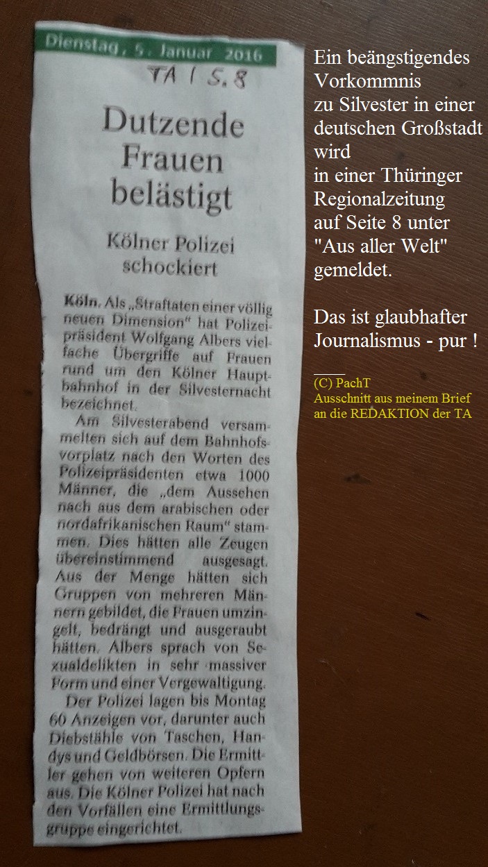 Ein beängstigendes Vorkommnis zu Silvester in einer deutschen Großstadt wird in einer Thüringer Regionalzeitung auf Seite 8 unter „Aus aller Welt“ gemeldet.