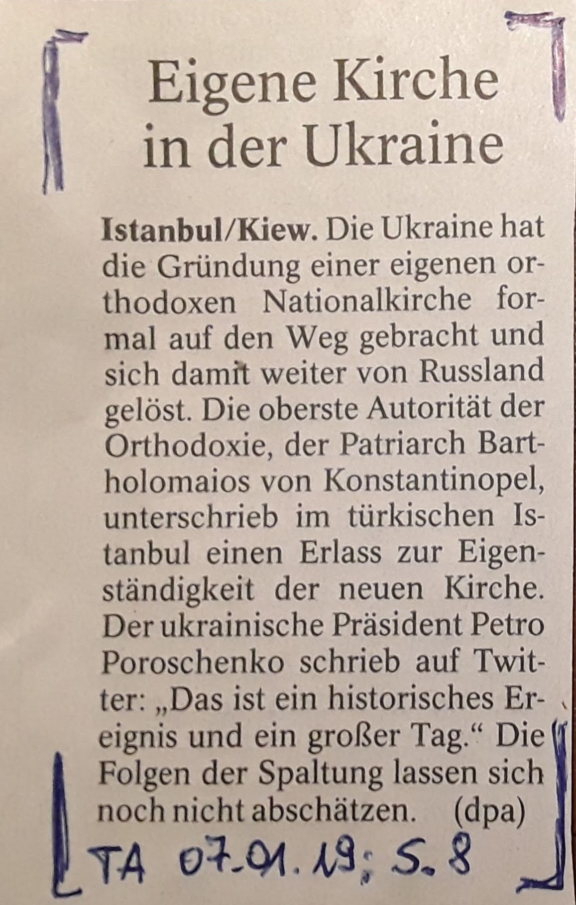 Ich hatte wohl doch die richtige Intuition. Mit Entsetzen habe ich am 07.01.19 die kleine Meldung “Eigene Kirche in der Ukraine“ zur Kenntnis genommen. Was maßt sich die Institution Kirche da über die Köpfe ihrer Gläubigen hinweg an, deren politischen Ansichten wohl vielfältig und folglich in keiner Weise uniformiert sind? Die Kirchen werden für mich immer unglaubwürdiger, weil ihre Verquickungen mit den weltlichen Machthabern auch auf internationaler Ebene nicht segensreich sein können.