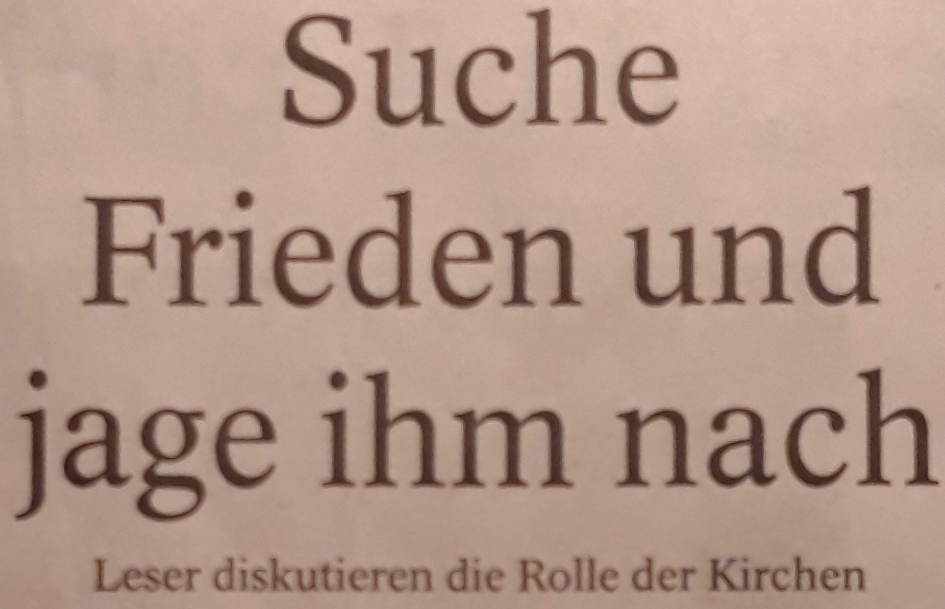 Dieser Tage nahm ich öffentlich kritisch Stellung zur Jahreslosung der evangelischen Kirche, die da lautet: “ Suche Frieden und jage ihm nach.“ Ich habe mich dazu wie folgt geäußert: “Den Frieden suchen – ja! Das Nachjagen aber hat für mich einen bitteren Beigeschmack, da zumeist nach einer Jagd auch Opfer zu beklagen sind.“