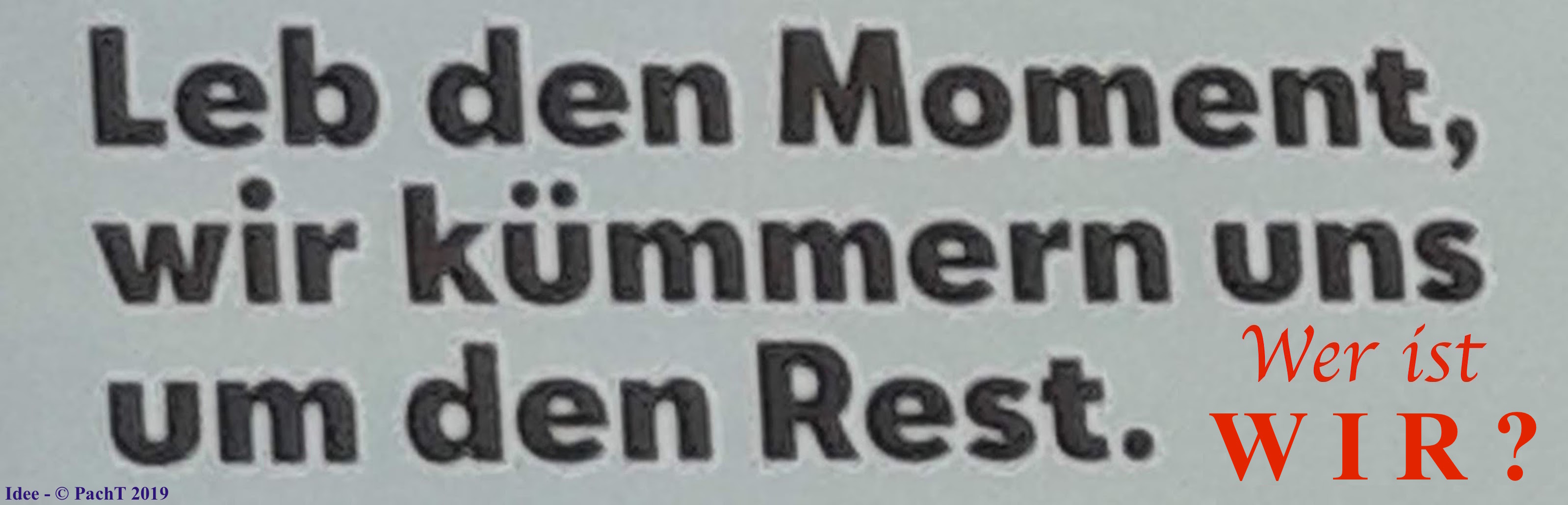 13.01.19 # WIR – wer ist das ? 13. Januar 201913. Januar 2019PachT _ Autor / Blogger 1 Kommentar “Der AUGENBLICK gehört dem FESTSAAL, das LEBEN dem WARTESAAL.“ … [H. W.] @ IDEE @ AUSFÜHRUNG @ Text- u. Fotoauswahl @ © PachT @ @@@@@@@@@@@@@@@@@@ Klicke, um auf X zu teilen (Wird in neuem Fenster geöffnet) X Klick, um auf Facebook zu teilen (Wird in neuem Fenster geöffnet) Facebook Gefällt mir Wird geladen …