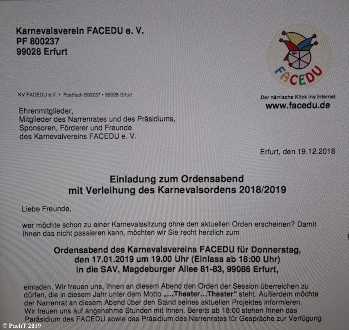 Der NARRENRAT tritt auf Einladung zusammenDANK den DAMEN vom EINLASS zum FaCeDu – ORDEN – EMPFÄNGNIS – ABENDDANK dem vereinsinternen SERVICEPERSONALDer SESSIONSORDEN Der SESSIONSORDEN in voller PrachtDer SAAL füllt sich …Der Vorsitzende des NARRENRATES eröffnet …Der derzeitige PRÄSIDENT informiert über den Stand der laufenden Session und nimmt dann die ORDENSVERLEIHUNG vor …links vom PRÄSIDENTEN die EHEMALIGEN – heute EHRENPRÄSIDENTENEHRENMITGLIEDER und MITGLIEDER des NARRENRATESWeitere EHRENMITGLIEDER und MITGLIEDER des NARRENRATESORDEN an die SPONSOREN