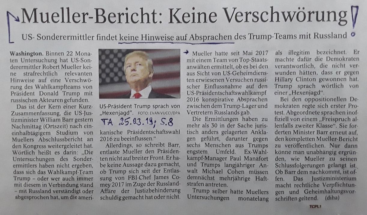 Eine Bilanz über die Anzahl der Berichterstattungen in den deutschen Medien seit Amtsantritt von US-Präsidenten Trump im Verhältnis zur publikums- und leserwirksamen Aufbereitung der politischen Probleme hierzulande wäre schon mal eine aufschlussreiche Studie. Die jüngste TA-Meldung über das Ergebnis der Sonderermittlungen zu Geheimabsprachen und ausgemachten Verschwörungen zwischen dem damaligen Wahlkampfteam Trumps und russischen Dienststellen fordert den Informationskonsument schon zum Nachdenken heraus – so er das überhaupt noch kann oder will!