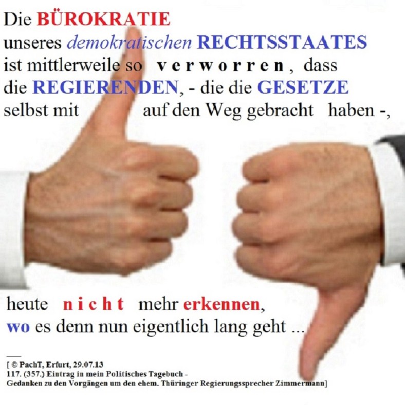 Als ich vor sechs Jahren am Stammtisch meine Meinung darüber kundtat, dass die Bürokratie unseres demokratischen Rechtsstaates mittlerweile so verworren ist, dass die Regierenden, – die die Gesetze selbst mit auf den Weg gebracht haben -, heute nicht mehr erkennen, wo es denn nun eigentlich lang geht“, wurde diese als lächerlich hingestellt. Dieser Tage lese ich, – nicht überrascht -, in der Regionalpresse: „Datenschutz kontra Kommunalwahlrecht … in der Kritik“. Nun werde ich zurückfragen, ob aus dieser Lächerlichkeit nicht doch ein ernsthaftes Problem geworden ist. Nicht nur, dass mittlerweile konträre Gesetze das gesellschaftliche Leben behindern, – nein -, im konkreten Falle müssen sogar Kandidaten für einen Posten als Volksvertreter Gefahr, – ausgehend von denen, die sie wählen sollen -, für Leben, Gesundheit, persönliche Freiheit und ähnliche schutzwürdigen Interessen für sich und ihre Angehörigen fürchten. Eine hausbackene Gefahr in Verzug! Oder wurde da bisher eine mögliche gesellschaftliche Schieflage verschwiegen?