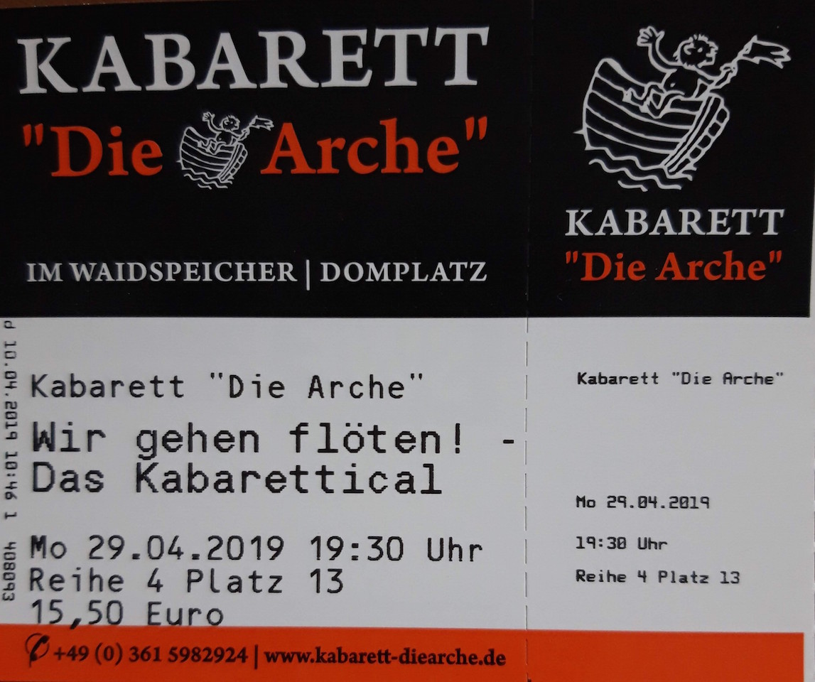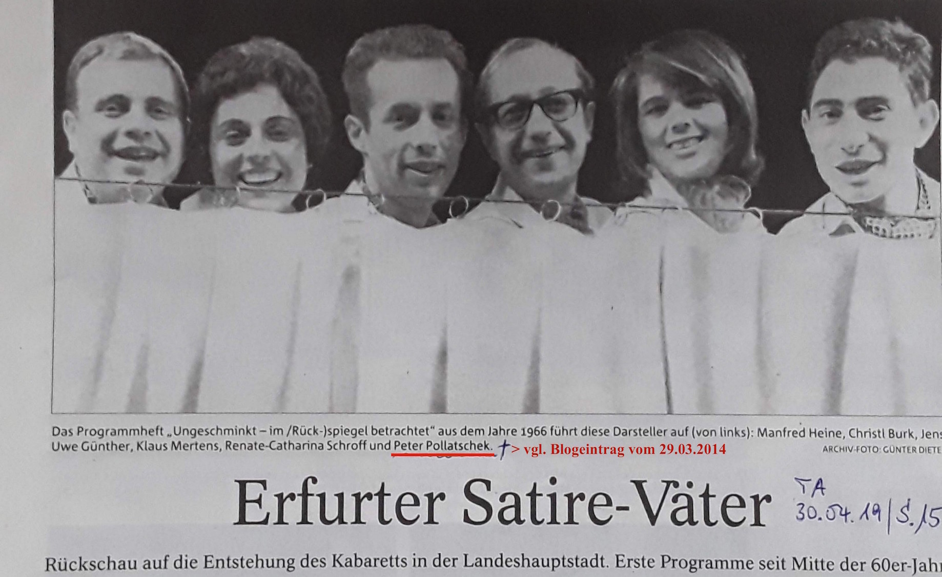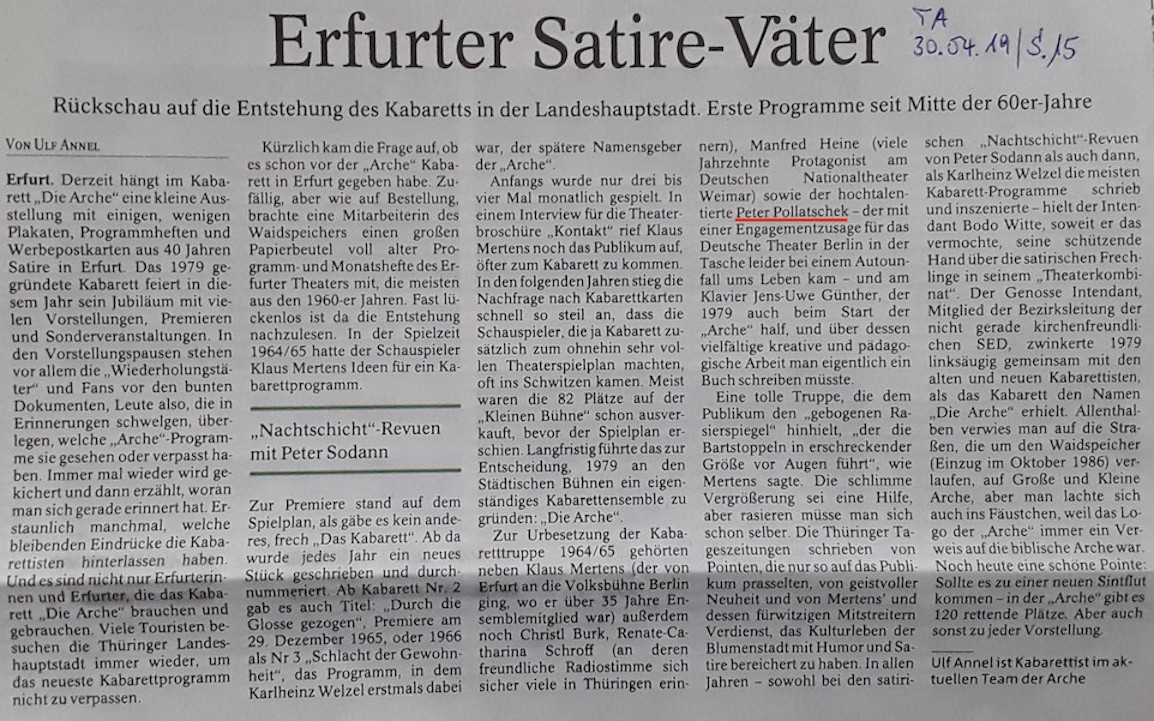 Am nächsten Morgen fand ich diesen PRESSEARTIKEL zum 40-jährigen JUBILÄUM des Erfurter KABARETTs, zu dessen ENSEMBLE auch mein guter BEKANNTER Peter Pollatschek gehörte … >>> h i e r :