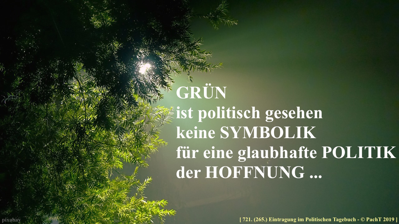 22.07.19 # Eine PARTEI, die GRÜN, – die HOFFNUNG -, verwässert # 22. Juli 201922. Juli 2019PachT _ Autor / Blogger 1 Kommentar Die AUSSAGEN und das HANDELNder Partei “BÜNDNID’90 / GRÜNE“provozierten die 721. (265.) TAGEBUCHNOTIZ: Grünsymbolik GRÜN ist politisch gesehen keine SYMBOLIK für eine glaubhafte POLITIKder HOFFNUNG …___© PachT 2019 “Wer seine EHRLICHKEIT plakatiert, führt etwas im SCHILDE.“ [P. H.] @ IDEE @ AUSFÜHRUNG @ TEXT / Fotoauswahl @ © PachT @ Klicke, um auf X zu teilen (Wird in neuem Fenster geöffnet) X Klick, um auf Facebook zu teilen (Wird in neuem Fenster geöffnet) Facebook Gefällt mir Wird geladen …