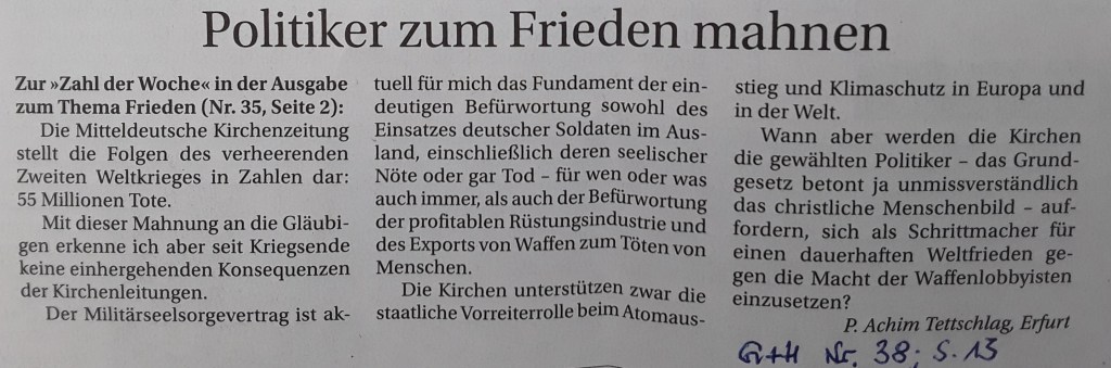 24.09.19 # WELTFRIEDEN statt III. WELTKRIEG # 24. September 201921. September 2019PachT _ Autor / Blogger 1 Kommentar Vor nicht allzu langer ZEIT las ich einen interessanten PRESSEARTIKEL … : Auf diesen musste ich nun doch reagieren … : “Der FRIEDE zwischen den VÖLKERN ist vom FRIEDEN in den MENSCHEN selbst abhängig.“ [J. C.] @ IDEE @ AUSFÜHRUNG @ TEXT / Bildauswahl @ © PachT @+++++++++++++++++ Klicke, um auf X zu teilen (Wird in neuem Fenster geöffnet) X Klick, um auf Facebook zu teilen (Wird in neuem Fenster geöffnet) Facebook Gefällt mir Wird geladen …