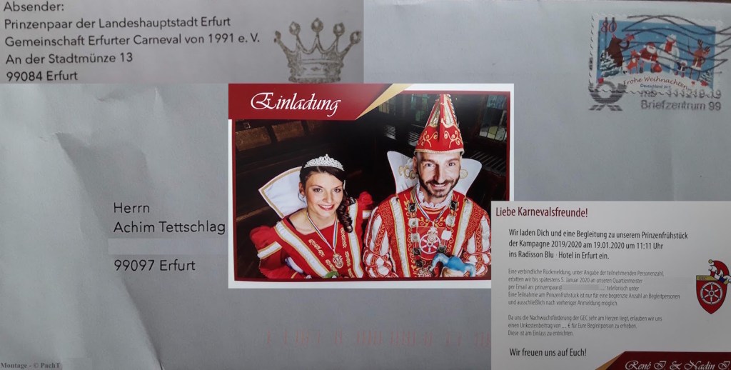17.12.19 # POSTBOTE rief : Ein närrischer BRIEF … # 17. Dezember 201913. Dezember 2019PachT _ Autor / Blogger 1 Kommentar wie „alle JAHRE wieder“ zu dieser ZEIT die EINLADUNG zum traditionellen PRINZENFRÜHSTÜCK: “Närrisches LASTER ist MORAL in VERKLEIDUNG.“ [PachT 2019] @ IDEE @ AUSFÜHRUNG @ TEXT / Fotos u. -montage @ © PachT @ Klicke, um auf X zu teilen (Wird in neuem Fenster geöffnet) X Klick, um auf Facebook zu teilen (Wird in neuem Fenster geöffnet) Facebook Gefällt mir Wird geladen …