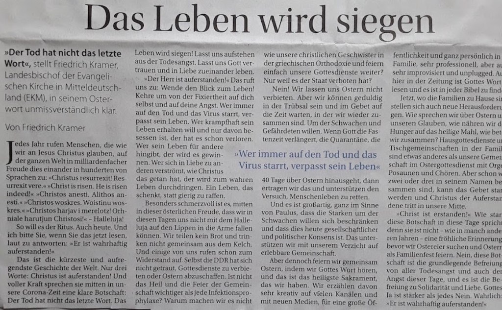 17.04.20 # Offene Gedanken # 17. April 202017. April 2020PachT _ Autor / Blogger 1 Kommentar zum Osterfest inmitten einer Krise… Zwei Presseartikel in der Osterausgabe von > G + H < forderten mich zum erneuten Nachdenken über ein brisantes Thema heraus: Hier nun meine, der Redaktion zugestellten Überlegungen: “Des MENSCHEN leidenschaftlicher GLAUBE besteht darin, dass er zu wissen glaubt.“[G.W. H.] @ IDEE @ AUSFÜHRUNG @ TEXT / Fotos @ © PachT @ Klicke, um auf X zu teilen (Wird in neuem Fenster geöffnet) X Klick, um auf Facebook zu teilen (Wird in neuem Fenster geöffnet) Facebook Gefällt mir Wird geladen …
