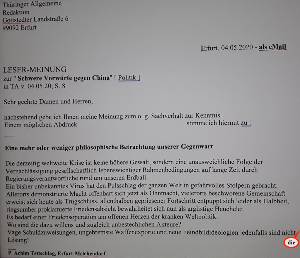 07.05.20 # Philosophische (?) Betrachtung der C – Krise # 7. Mai 20206. Mai 2020PachT _ Autor / Blogger 1 Kommentar Eine Zeitungsmeldung … … und meine Meinung dazu an die Redaktion … “Ich weiss nicht, wer die WELT erschaffen hat; ich weiss aber, wer sie vernichten wird.“[St.J. L.] @ IDEE @ AUSFÜHRUNG @ TEXT / Foto u. Auswahl @ © PachT @ Klicke, um auf X zu teilen (Wird in neuem Fenster geöffnet) X Klick, um auf Facebook zu teilen (Wird in neuem Fenster geöffnet) Facebook Gefällt mir Wird geladen …