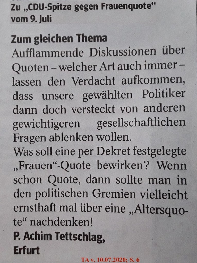 12.07.20 #Dreifaltigkeit der #Frauenquote in ihrer #Leibhaftigkeit – weiter so ! 12. Juli 202012. Juli 2020PachT _ Autor / Blogger 1 Kommentar @ IDEE @ AUSFÜHRUNG @ Text / Foto @ © PachT @ Schon h e u t edie HELDINNEN des JAHRES 2020 ? … ? … ? … ? Klicke, um auf X zu teilen (Wird in neuem Fenster geöffnet) X Klick, um auf Facebook zu teilen (Wird in neuem Fenster geöffnet) Facebook Gefällt mir Wird geladen …