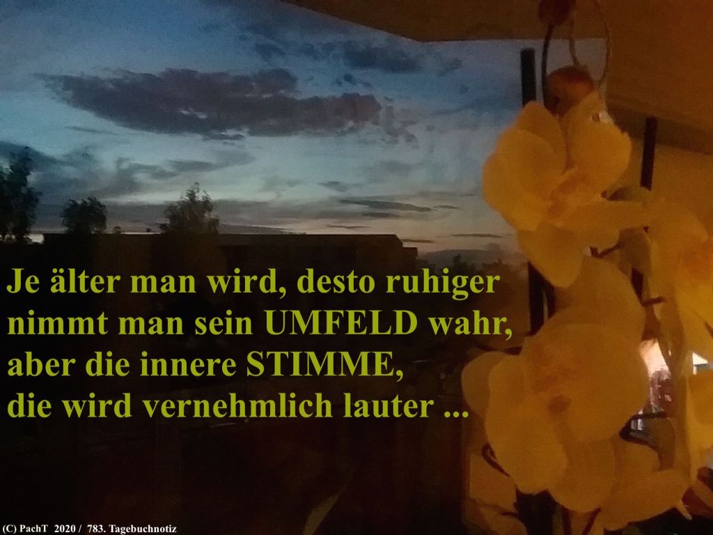 31.08.20 #Gelassenheit im #Alter hat eine #Stimme # 31. August 202026. August 2020PachT _ Autor / Blogger 5 Kommentare Meine 783. Tagebuchnotizmit einer Feststellung nach dem 75-sten G e l a s s e n h e i t Je älter man wird, desto ruhiger nimmt man sein UMFELD wahr, aber die innere STIMME, die wird vernehmlich lauter … __ © PachT 2020 “Hörig wird man mit zunehmenden ALTER sich selbst.“[R. V.] IDEE @ AUSFÜHRUNG @ Text / Fotoauswahl @ © PachT Klicke, um auf X zu teilen (Wird in neuem Fenster geöffnet) X Klick, um auf Facebook zu teilen (Wird in neuem Fenster geöffnet) Facebook Gefällt mir Wird geladen …