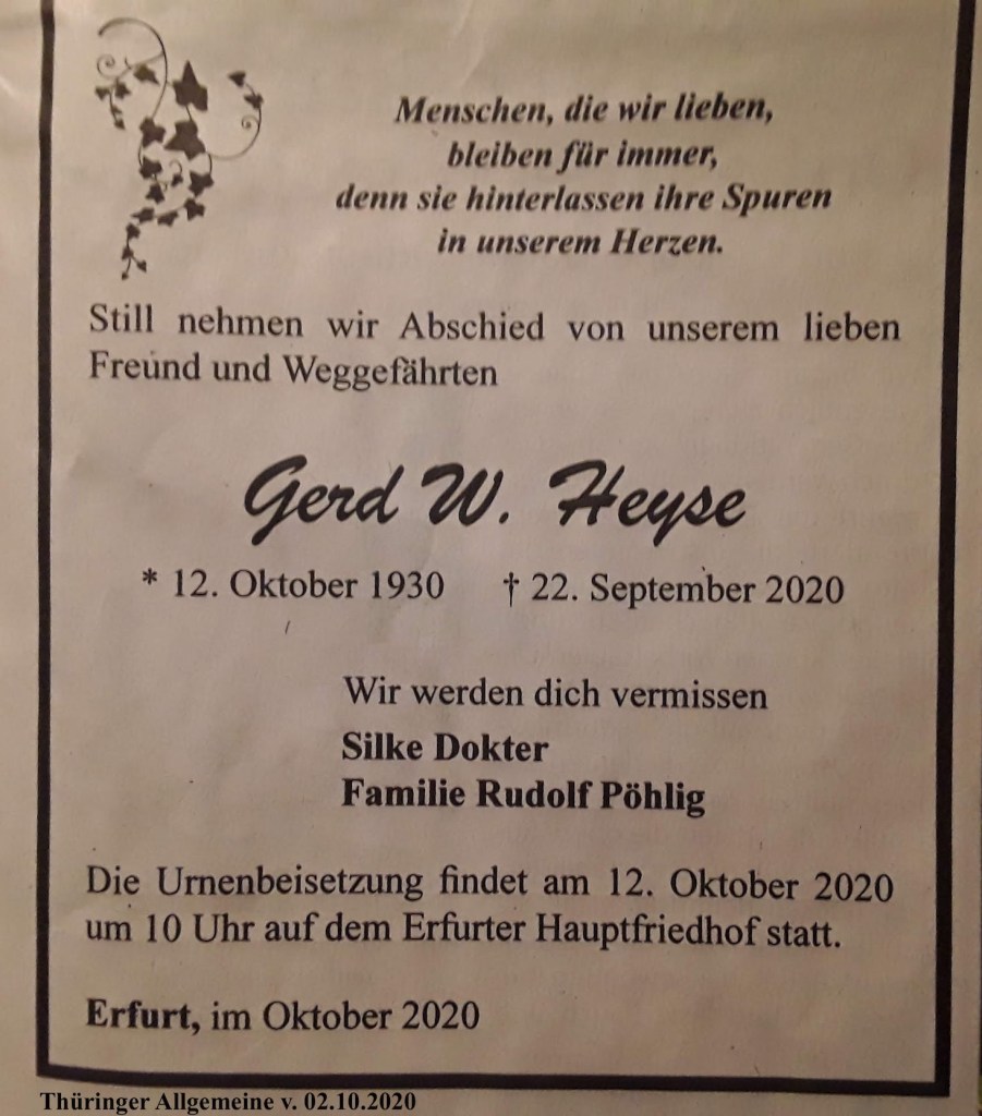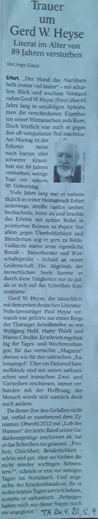06.10.20 Die #Traueranzeige, die mich traurig stimmte … 6. Oktober 20205. Oktober 2020PachT _ Autor / Blogger 1 Kommentar Mit dem Verweis auf > [G.W. H.] < habe ich seit über zehn Jahren APHORISMEN auch aus seiner Feder in meinem Blog wiedergegeben … “Für je klüger ein KUNST-PUBLIKUM sich hält, für desto dümmer kann man es verkaufen.“[Gerd W. Heyse] “APHORISMEN sind TELEGRAMME stenografierten LEBENSGEFÜHLS.“[K. W.] IDEE @ AUSFÜHRUNG @ Text / Foto @ © PachT Klicke, um auf X zu teilen (Wird in neuem Fenster geöffnet) X Klick, um auf Facebook zu teilen (Wird in neuem Fenster geöffnet) Facebook Gefällt mir Wird geladen …
