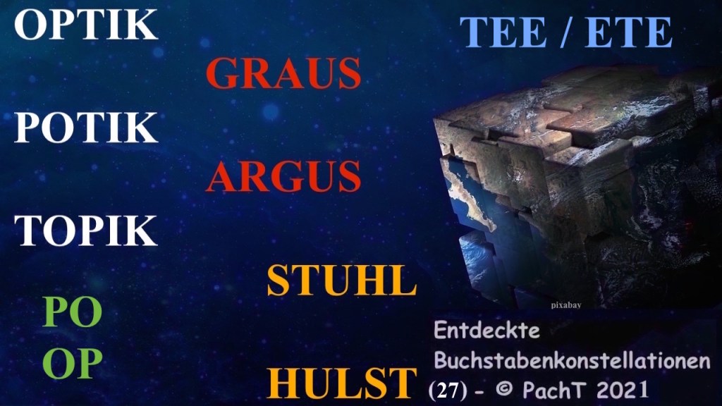12.02.21 #Spiele mit #Buchstaben (27) # 12. Februar 20219. Februar 2021PachT _ Autor / Blogger “Im ANFANG war das WORT – am ENDE die PHRASE.“[St.J. L.] IDEE @ AUSFÜHRUNG @ Text / Fotos @ © PachT Klicke, um auf X zu teilen (Wird in neuem Fenster geöffnet) X Klick, um auf Facebook zu teilen (Wird in neuem Fenster geöffnet) Facebook Gefällt mir Wird geladen … Ähnliche Beiträge