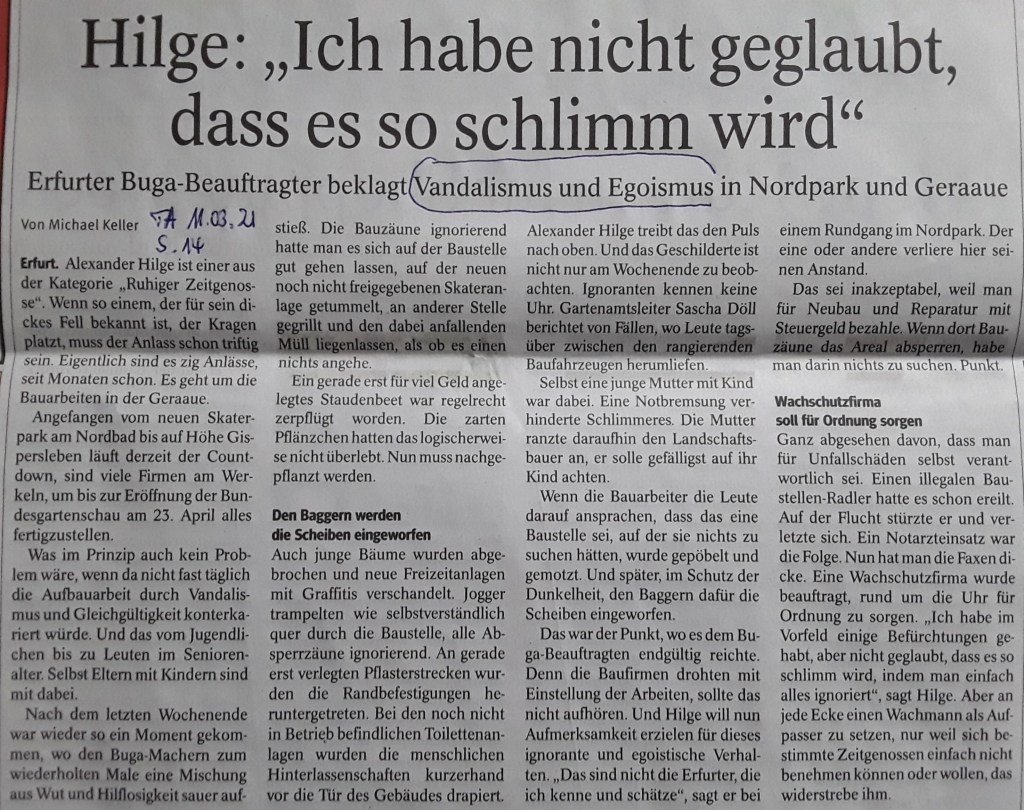 Hier: Meldung der Thür. Allgemeine v. 11.03.2021; Seite 14 / Ausgabe Erfurt