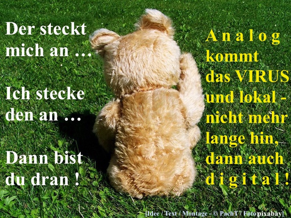 27.05.21 #COVID-19 – #Abzählreim für #Kinder 27. Mai 202127. Mai 2021PachT _ Autor / Blogger 1 Kommentar IDEE @ AUSFÜHRUNG @ Text / Fotoauswahl @ © PachT Klicke, um auf X zu teilen (Wird in neuem Fenster geöffnet) X Klick, um auf Facebook zu teilen (Wird in neuem Fenster geöffnet) Facebook Gefällt mir Wird geladen …