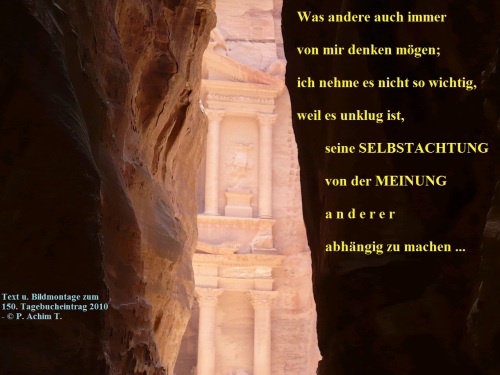 Was andere auch immer von mir denken mögen; ich nehme es nicht so wichtig, weil es unklug ist, seine SELBSTACHTUNG von der MEINUNG a n d e r e r abhängig zu machen ... ___ © PachT 2010 ___