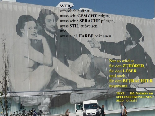 WER ö f f e n t l i c h auftritt und nichts zu verbergen hat, muss sich auch nicht verschanzen ... Deshalb sollte man sein GESICHT zeigen, seine SPRACHE pflegen, STIL aufweisen und auch FARBE bekennen. Nur so wird der andere für andere auf intellektueller Grundlage interessant. ___ © PachT 2010 Gedanken über pseudonymes Auftreten im Internet hier: überarbeitete Version 2013