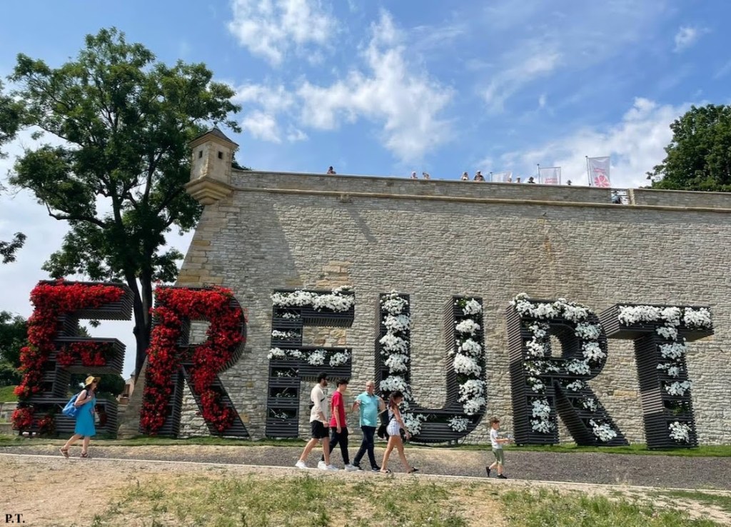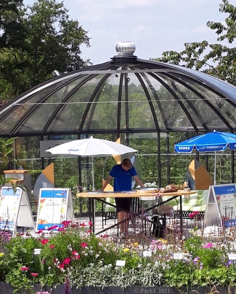 Blick vom Domplatz (Süd) aus der Straßenbahn zum PETERSBERGDas war natürlich ein Superstart des Ausstellungsrundgangs: Die Haupthalle wegen Umbau geschlossen, der Eintrittspreis blieb unverändert.Das große Blumenfeld sieht genauso attraktiv aus …… wie immer die Jahre zuvor auch … Die Besucher begeben sich zu den beiden rechts vom Blumenfeld befindlichen Ausstellungshallen …Zweifelsfrei haben diese auch eine einladende Ausstrahlung!Doch denkste! Woher soll der Besucher auch wissen, dass beide Hallen aus bautechnischen Gründen nicht betreten werden dürfen. Systemkonform wird das mit einer tollen Fassade kaschiert; die Besucher gehen achselzuckend weiter …Dann erreicht man eine neu errichtete Halle. Diese ist betretbar und erfreut durch ihre dekorativ sehr schöne Gestaltung …COVID19-bedingt kann man mit “Ansage“ in der CAPONNIERE sehr gut speisen.Man hat von der CAPONNIERE auch einen herrlichen Blick auf den Aussichtsturm, von dem aus sehr viele Besucher den Panoramablick über Erfurt genossen …Auf dem Weg zum Japanischen Garten erkennt man auch das Erfurter GARTENBAUMUSEUM …Da der > MDR Thüringen < in unmittelbarer Nachbarschaft zum egaPark liegt, hat dieser auch einen eigenen Pavillon für gartenbezogene Fernsehsendungen und -aufzeichnungen. Übrigens hat die Sendeanstalt des MDR eine nicht unwesentlich große Fläche der damaligen >IGA< vereinnahmt … Großvater und Enkeltochter machen eine Pause im > Japanischen Garten < und ein Erinnerungsfoto …Ein Konzertbesuch ( Klezmer ) war zeitlich auch noch drin …Begegnung auf dem Weg zum Ausgang …