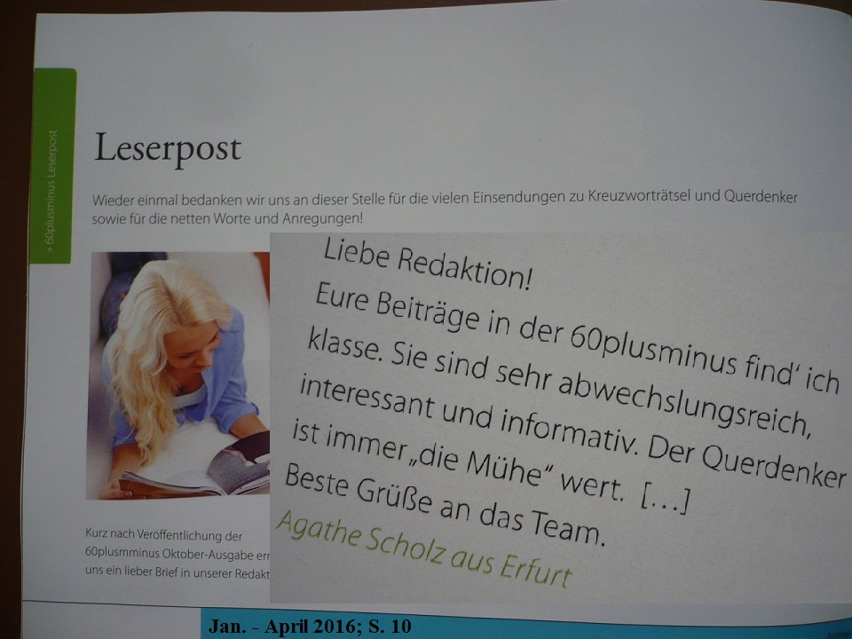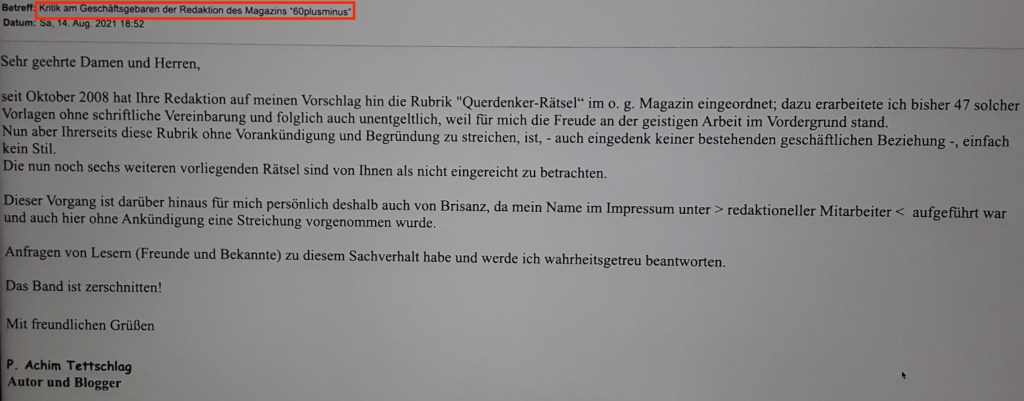 seit Oktober 2008 hat Ihre Redaktion auf meinen Vorschlag hin die Rubrik „Querdenker-Rätsel“ im o. g. Magazin eingeordnet; dazu erarbeitete ich bisher 47 solcher Vorlagen ohne schriftliche Vereinbarung und folglich auch unentgeltlich, weil für mich die Freude an der geistigen Arbeit im Vordergrund stand. Nun aber Ihrerseits diese Rubrik ohne Vorankündigung und Begründung zu streichen, ist, – auch eingedenk keiner bestehenden geschäftlichen Beziehung -, einfach kein Stil. Die nun noch sechs weiteren vorliegenden Rätsel sind von Ihnen als nicht eingereicht zu betrachten. Dieser Vorgang ist darüber hinaus für mich persönlich deshalb auch von Brisanz, da mein Name im Impressum unter > redaktionelle Mitarbeiter < aufgeführt war und auch hier ohne Ankündigung eine Streichung vorgenommen wurde. Anfragen von Lesern (Freunde und Bekannte) zu diesem Sachverhalt habe und werde ich wahrheitsgetreu beantworten.
