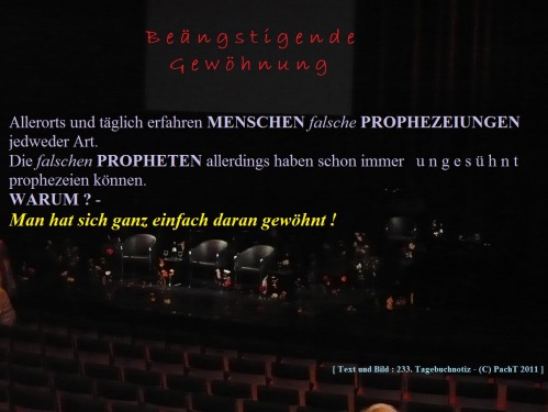 Allerorts und täglich erfahren MENSCHEN falsche PROPHEZEIUNGEN jedweder Art. Die falschen PROPHETEN allerdings haben schon immer ungesühnt prophezeien können. WARUM? Man hat sich ganz einfach daran gewöhnt! ___ © PachT 2011 ___