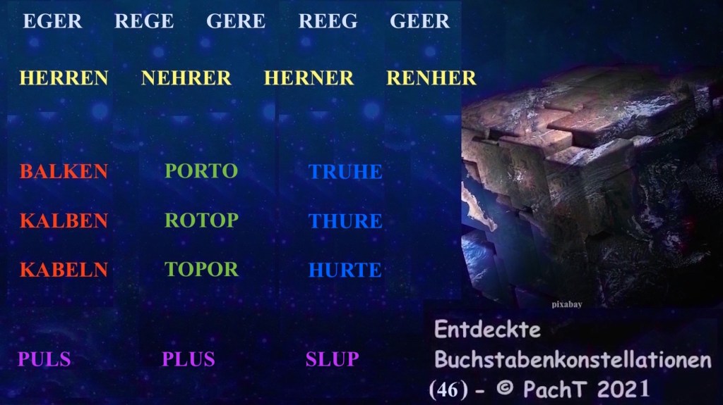 19.10.21 #Spiele mit #Buchstaben (46) # 19. Oktober 202117. Oktober 2021PachT _ Autor / Blogger Kommentar hinterlassen “Jeder SCHRITT führt näher zum ZIEL. Das gilt auch für RÜCKSCHRITTE.“ [E. J.] IDEE @ AUSFÜHRUNG @ Text / Foto / Auswahl /© PachT Klicke, um auf X zu teilen (Wird in neuem Fenster geöffnet) X Klick, um auf Facebook zu teilen (Wird in neuem Fenster geöffnet) Facebook Gefällt mir Wird geladen …
