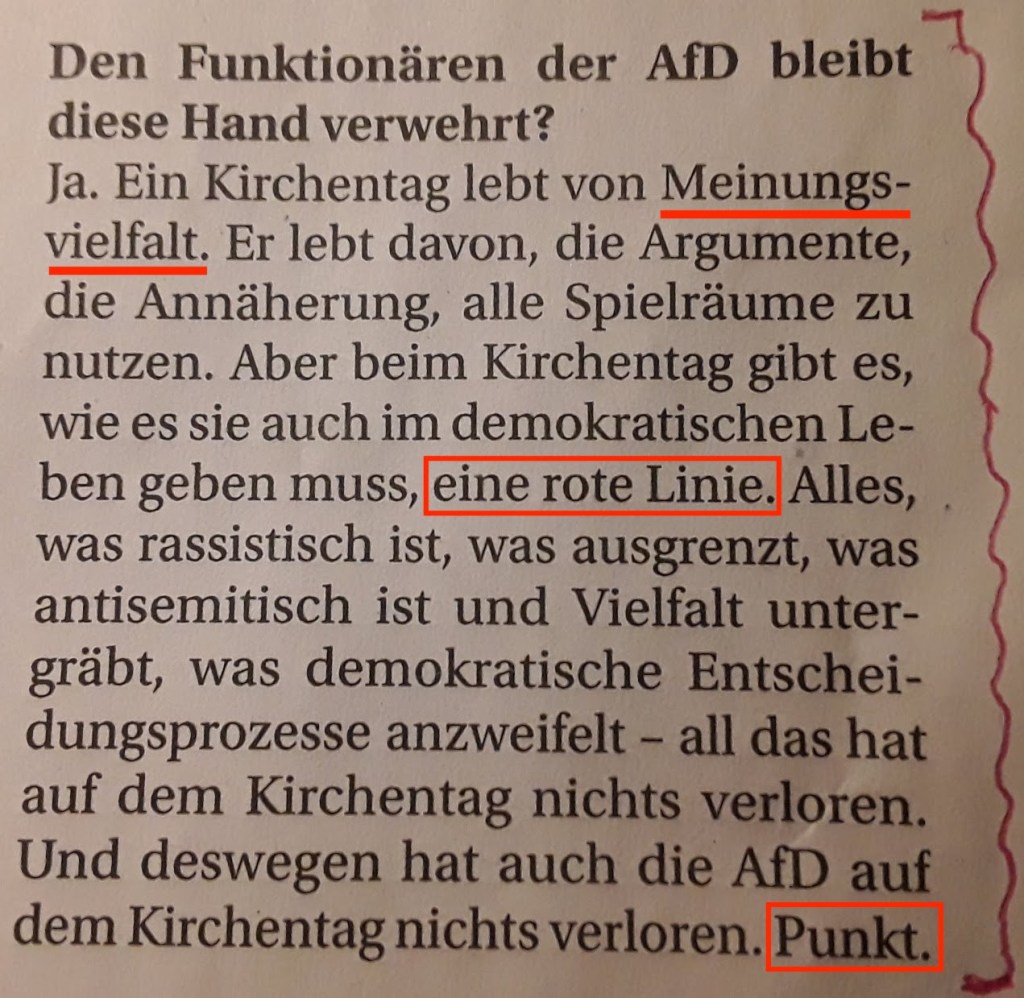 Zum anderen meine ich, - und ich bin fürwahr kein AfD-Anhänger oder Befürworter der rechten und anderer extremen Gruppierungen in unserer Gesellschaft -, dass eine politische Ausgrenzung immer eine Vertiefung der Gräben in einer Gemeinschaft zur Folge hat. Die Menschheitsgeschichte zeigt es mit aller Eindeutigkeit auf. Ich sehe allerdings auch eine fragwürdige Einseitigkeit dieser Botschaft, da die unser Zusammenleben stark schädigenden linksextremen Vorkommnisse und deren politischen Hintergründe hierzulande mit keiner Silbe und ohne Verweis auf die “rote Linie“ auf dem Kirchentag benannt werden.
