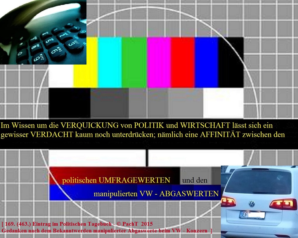 Im Wissen um die VERQUICKUNG von POLITIK und WIRTSCHAFT lässt sich ein gewisser VERDACHT kaum noch unterdrücken; nämlich eine AFFINITÄT zwischen den politischen UMFRAGEWERTEN und den manipulierten VW-ABGASWERTEN ___ © PachT 2015 SSW 463 / 169 Gedanken nach dem Bekanntwerden manipulierter Abgaswerte beim VW - Konzern in den USA ___