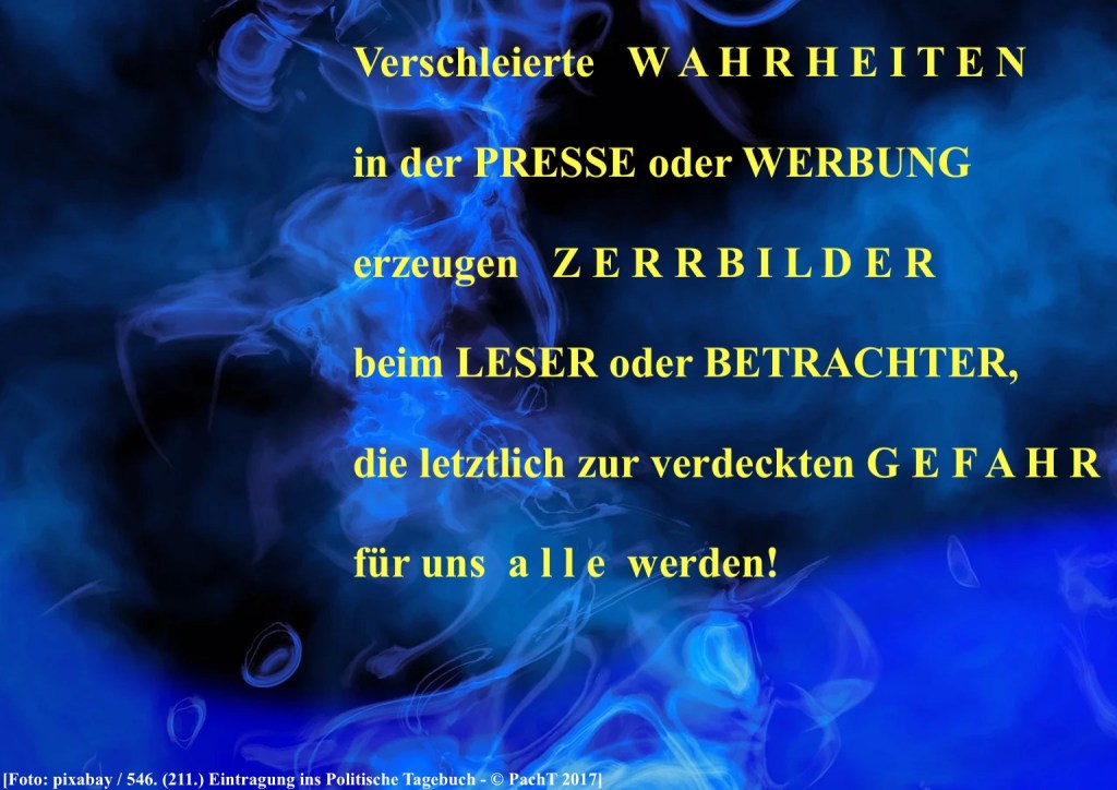 Verschleierte W A H R H E I T E N in der PRESSE oder WERBUNG erzeugen Z E R R B I L D E R beim LESER oder BETRACHTER, die letztlich zur verdeckten G E F A H R für uns a l l e werden! ___ © PachT 2017 SSW 546 / 211 ___