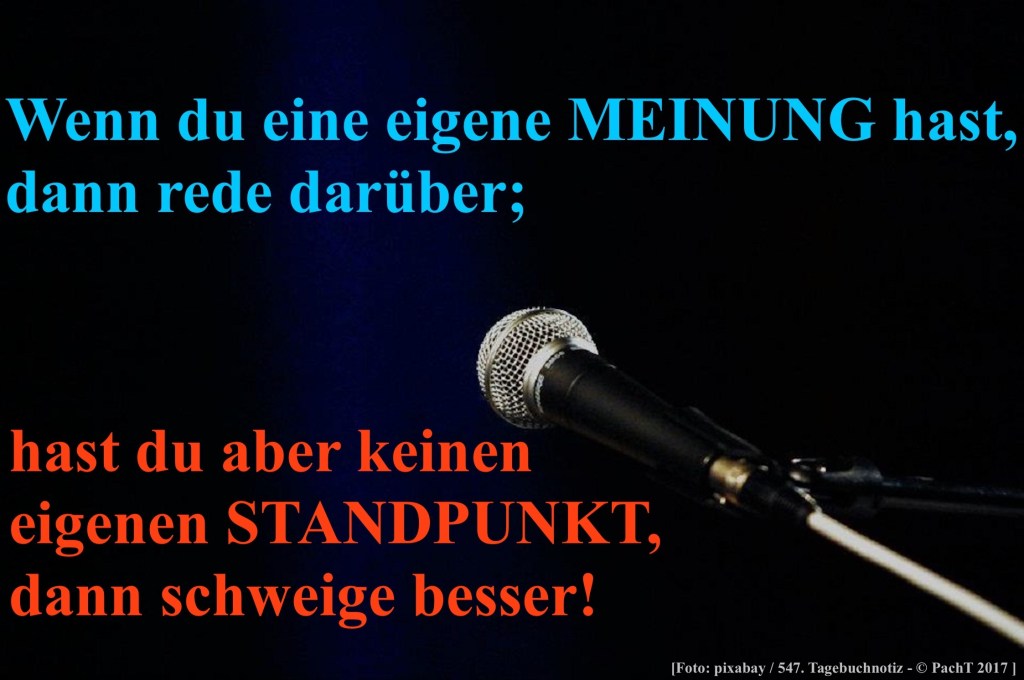 Wenn du eine eigene MEINUNG hast, dann rede darüber; hast du aber keinen eigenen STANDPUNKT, dann schweige besser! ___ © PachT 2017 SSW 547 ___