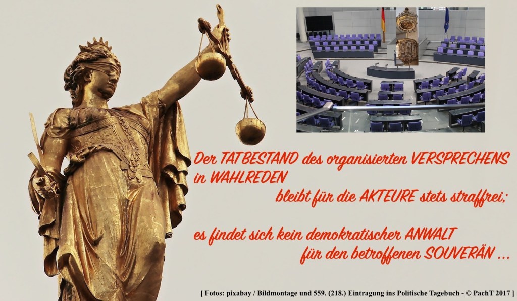 Der TATBESTAND des organisierten VERSPRECHENS in WAHLREDEN bleibt für die AKTEURE stets straffrei; es findet sich kein demokratischer ANWALT für den betroffenen SOUVERÄN ... ___ © PachT 2017 SSW 559 / 218 Gedanken über das Verwässern der Wahlprogramme im Zuge von machtorientierten Koalitionsverhandlungen ___