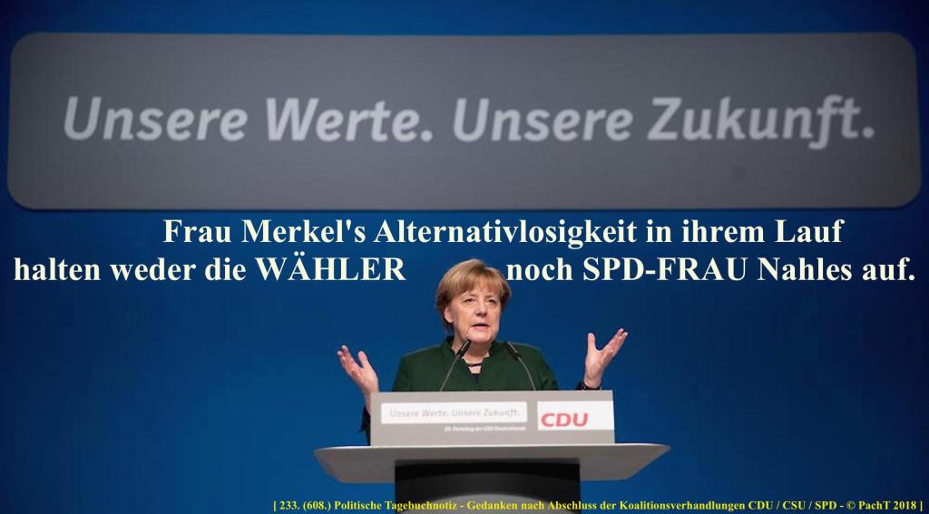 Frau Merkel's Alternativlosigkeit in ihrem Lauf halten weder die WÄHLER noch SPD-Frau Nahles auf. ___ © PachT 2018 SSW 608 / 233 Gedanken nach Abschluss der Koalitionsverhandlungen CDU / CSU / SPD ___