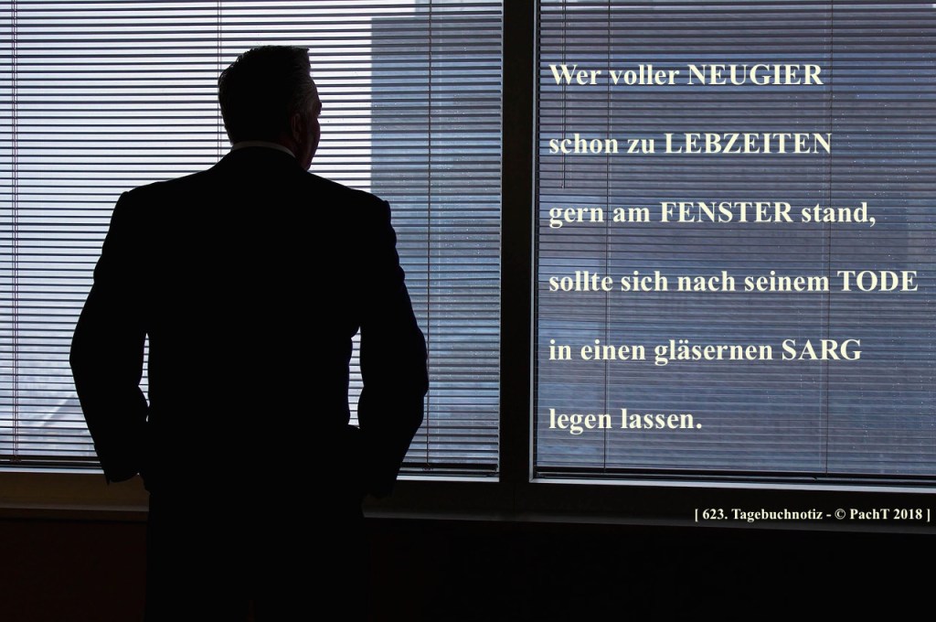 Wer voller NEUGIER schon zu LEBZEITEN gern am FENSTER stand, sollte sich nach seinem TODE in einen gläsernen SARG legen lassen. ___ © PachT 2018 SSW 623 ___