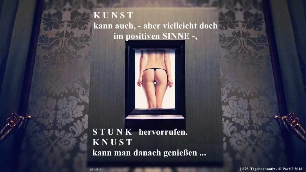 K U N S T kann auch, - aber vielleicht doch im positiven SINNE -, S T U N K hervorrufen. K N U S T kann man danach genießen ... ___ © PachT 2018 SSW 675 ___