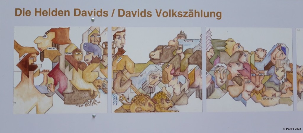 Von hieraus nahmen wir den Weg in Richtung Reuter-Villa, auf dem uns rechtsseitig eine BILDERGALERIE mit Auszügen aus der uns bis lang unbekannten WIEDMANN-BIBEL begleitete: