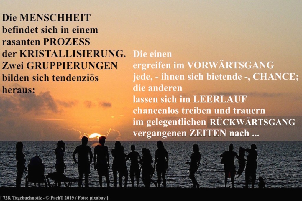 Die MENSCHHEIT befindet sich in einem rasanten PROZESS der KRISTALLISIERUNG. Zwei GRUPPIERUNGEN bilden sich tendenziös heraus: Die einen ergreifen im VORWÄRTSGANG jede, - ihnen sich bietende -, CHANCE; die anderen lassen sich im LEERLAUF chancenlos treiben und trauern im gelegentlichen RÜCKWÄRTSGANG vergangenen ZEITEN nach ... ___ © PachT 2019 SSW 728 ___