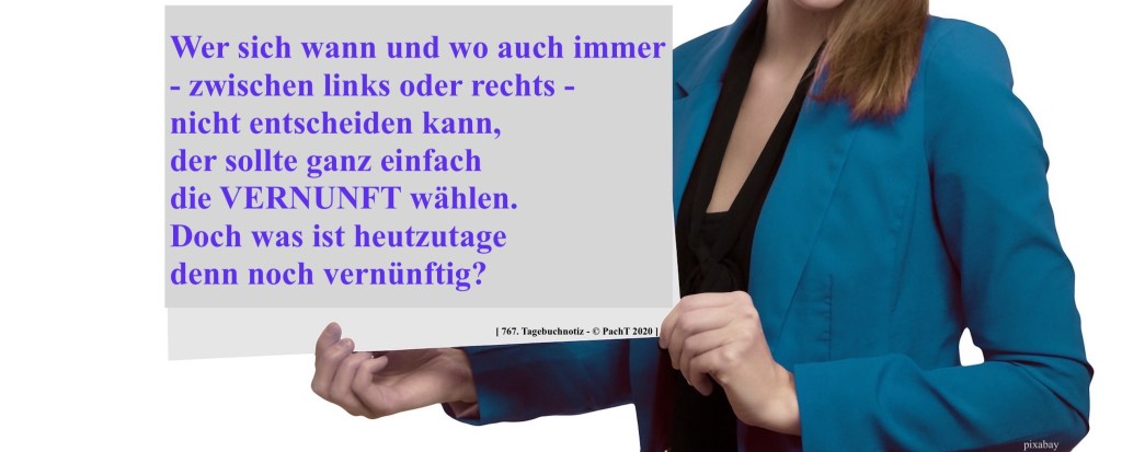 Wer sich wann und wo auch immer - zwischen links oder rechts - nicht entscheiden kann, der sollte ganz einfach die VERNUNFT wählen. Doch was ist heutzutage denn noch vernünftig? __ © PachT 2020 SSW 767 Meine Gedanken über Wahlverhalten ___