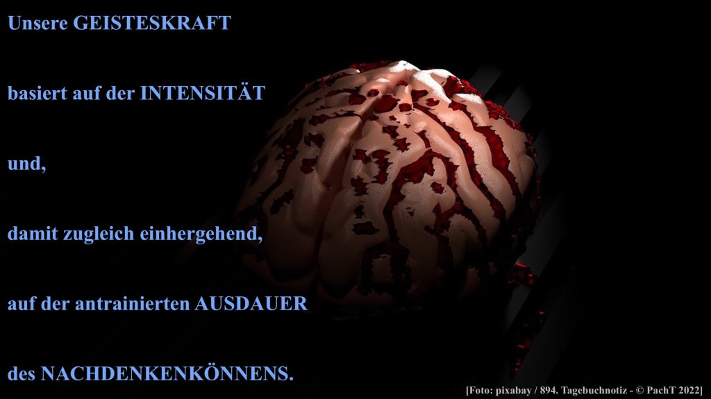 Unsere GEISTESKRAFT basiert auf der INTENSITÄT und damit zugleich einhergehend auf der antrainierten AUSDAUER des NACHDENKENKÖNNENS. ___ © PachT 2022 SSW 894 Gedanken über das konzentrierte Denken ***