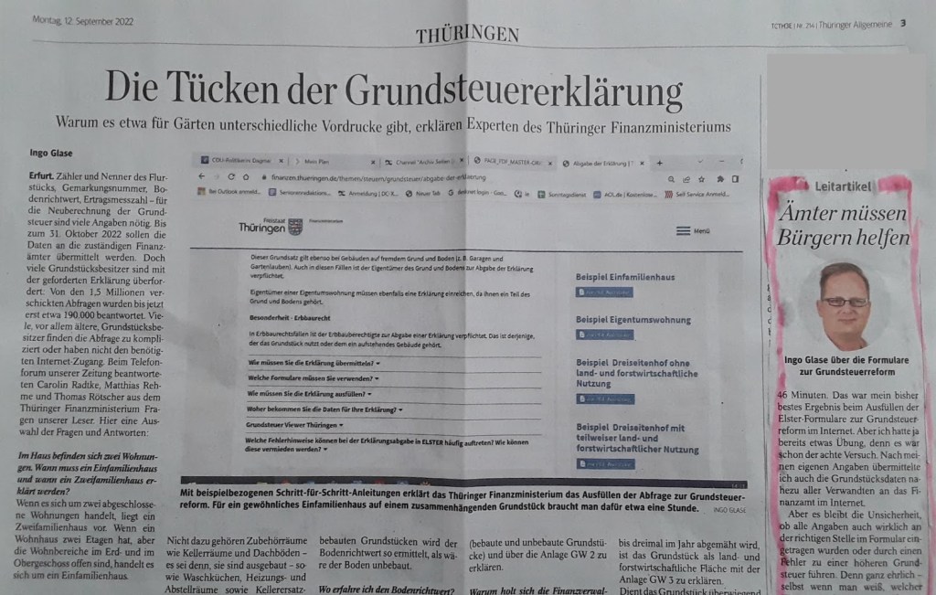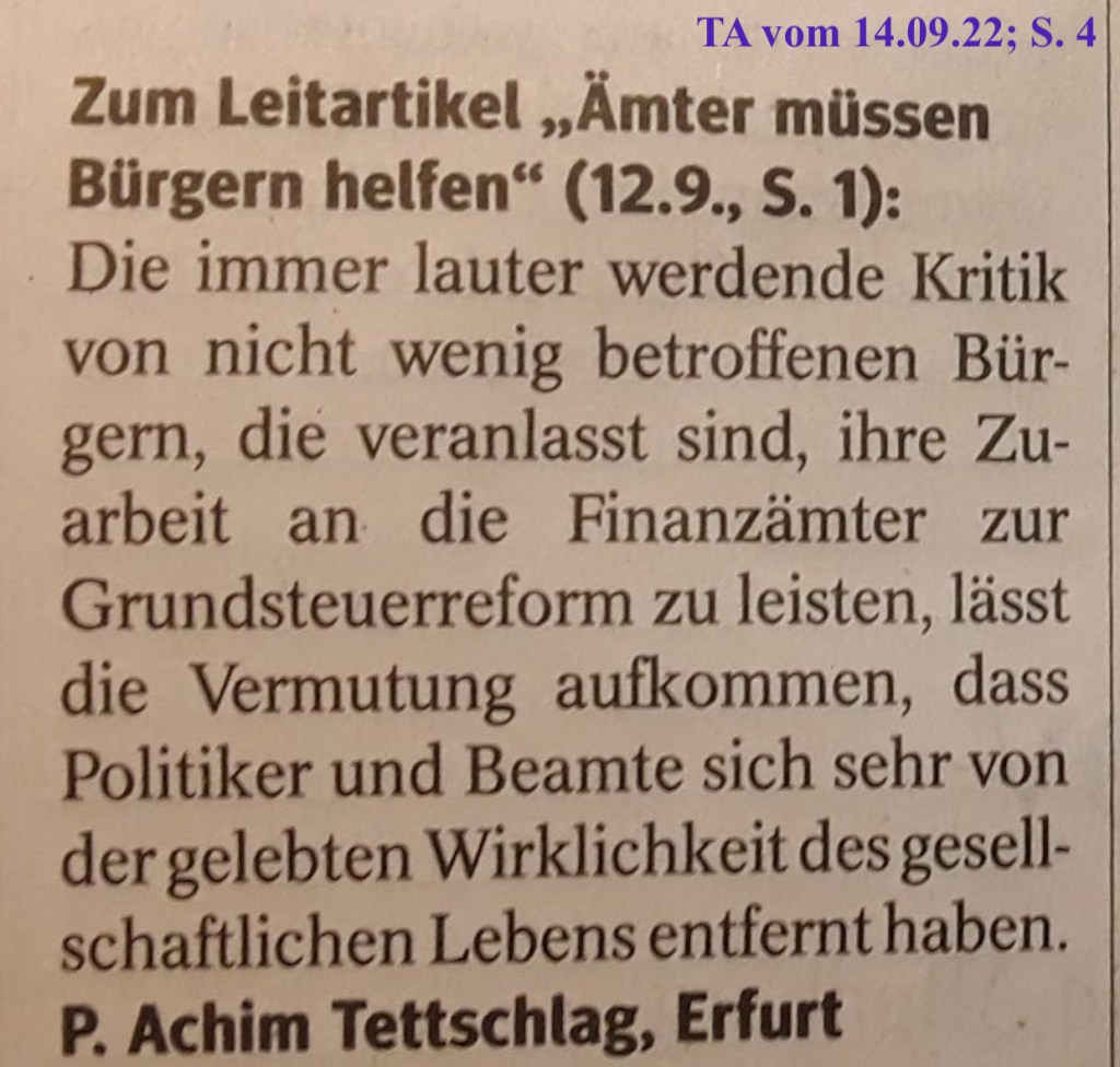 Die immer lauter werdende Kritik von nicht wenig betroffenen Bürgern, die veranlasst sind, ihre Zuarbeit an die Finanzämter zur Grundsteuerreform zu leisten, lässt die Vermutung aufkommen, dass Politiker und Beamte sich sehr von der gelebten Wirklichkeit des gesellschaftlichen Lebens entfernt haben.