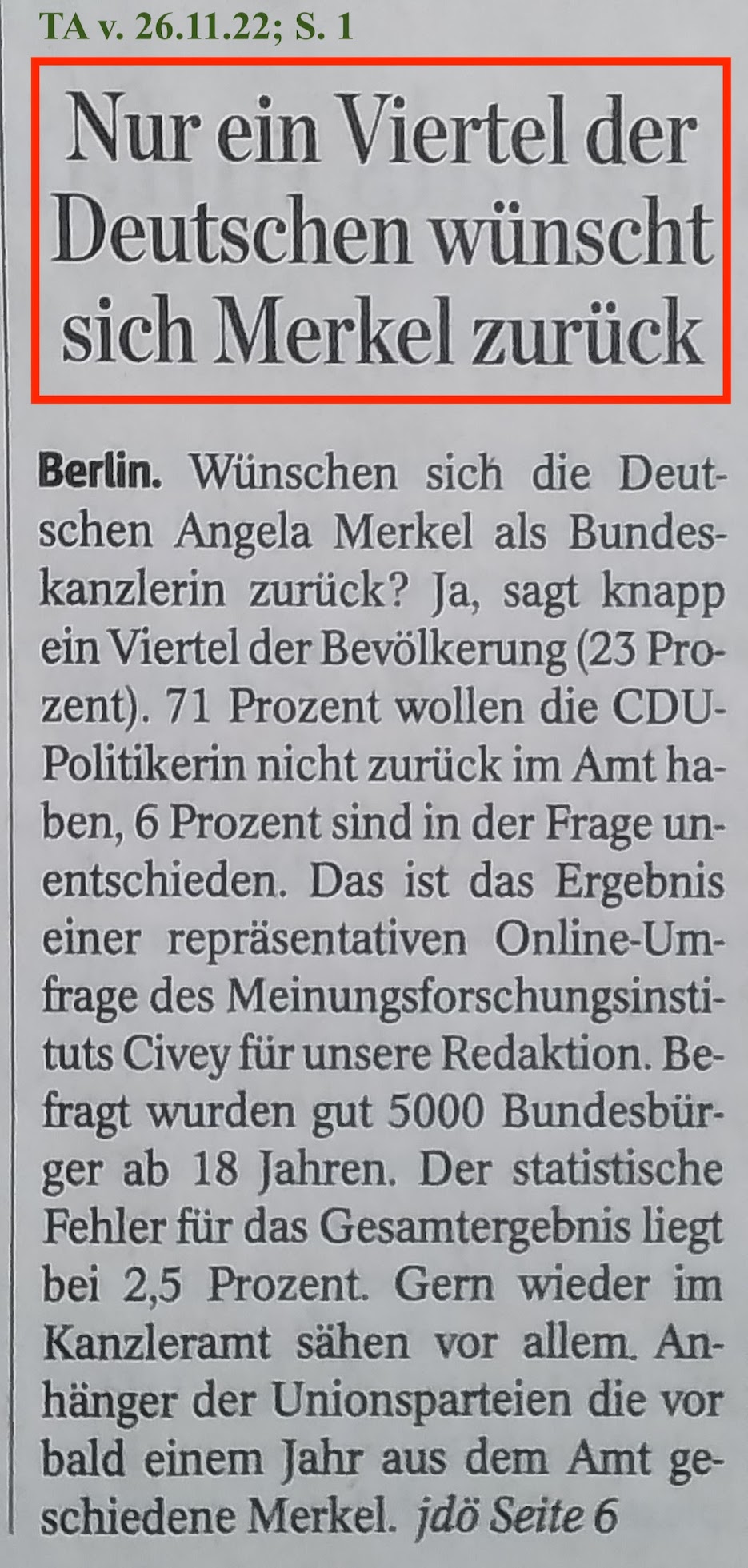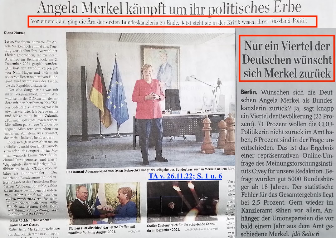 01.12.22 #UMFRAGE zu 16 Jahren #KANZLERSCHAFT von Frau #MERKEL # 1. Dezember 20221. Dezember 2022PachT _ Autor / Blogger 1 Kommentar “Der ABSCHIED aus AMT und WÜRDEN ist wie ein WEGGANG aus einem blumenreichen GARTEN in einen einsamen WALD.“ [O. B.-A.] IDEE @ AUSFÜHRUNG @ Text / Fotoauswahl @© PachT Klicke, um auf X zu teilen (Wird in neuem Fenster geöffnet) X Klick, um auf Facebook zu teilen (Wird in neuem Fenster geöffnet) Facebook Gefällt mir Wird geladen …