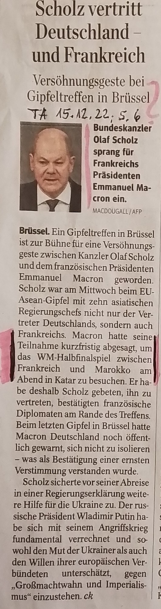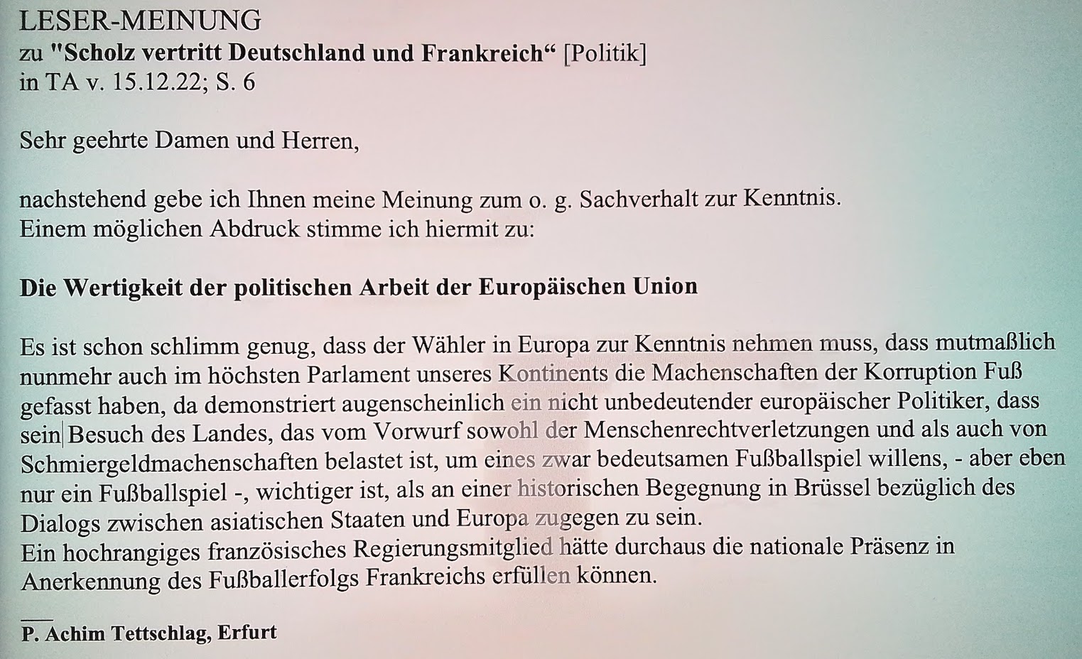 Die Wertigkeit der politischen Arbeit der Europäischen Union Es ist schon schlimm genug, dass der Wähler in Europa zur Kenntnis nehmen muss, dass mutmaßlich nunmehr auch im höchsten Parlament unseres Kontinents die Machenschaften der Korruption Fuß gefasst haben, da demonstriert augenscheinlich ein nicht unbedeutender europäischer Politiker, dass sein Besuch des Landes, das vom Vorwurf sowohl der Menschenrechtsverletzungen und als auch von Schmiergeldmachenschaften belastet ist, um eines zwar bedeutsamen Fußballspiel willens, - aber eben nur ein Fußballspiel -, wichtiger ist, als an einer historischen Begegnung in Brüssel bezüglich des Dialogs zwischen asiatischen Staaten und Europa zugegen zu sein. Ein hochrangiges französisches Regierungsmitglied hätte durchaus die nationale Präsenz in Anerkennung des Fußballerfolgs Frankreichs erfüllen können. ___