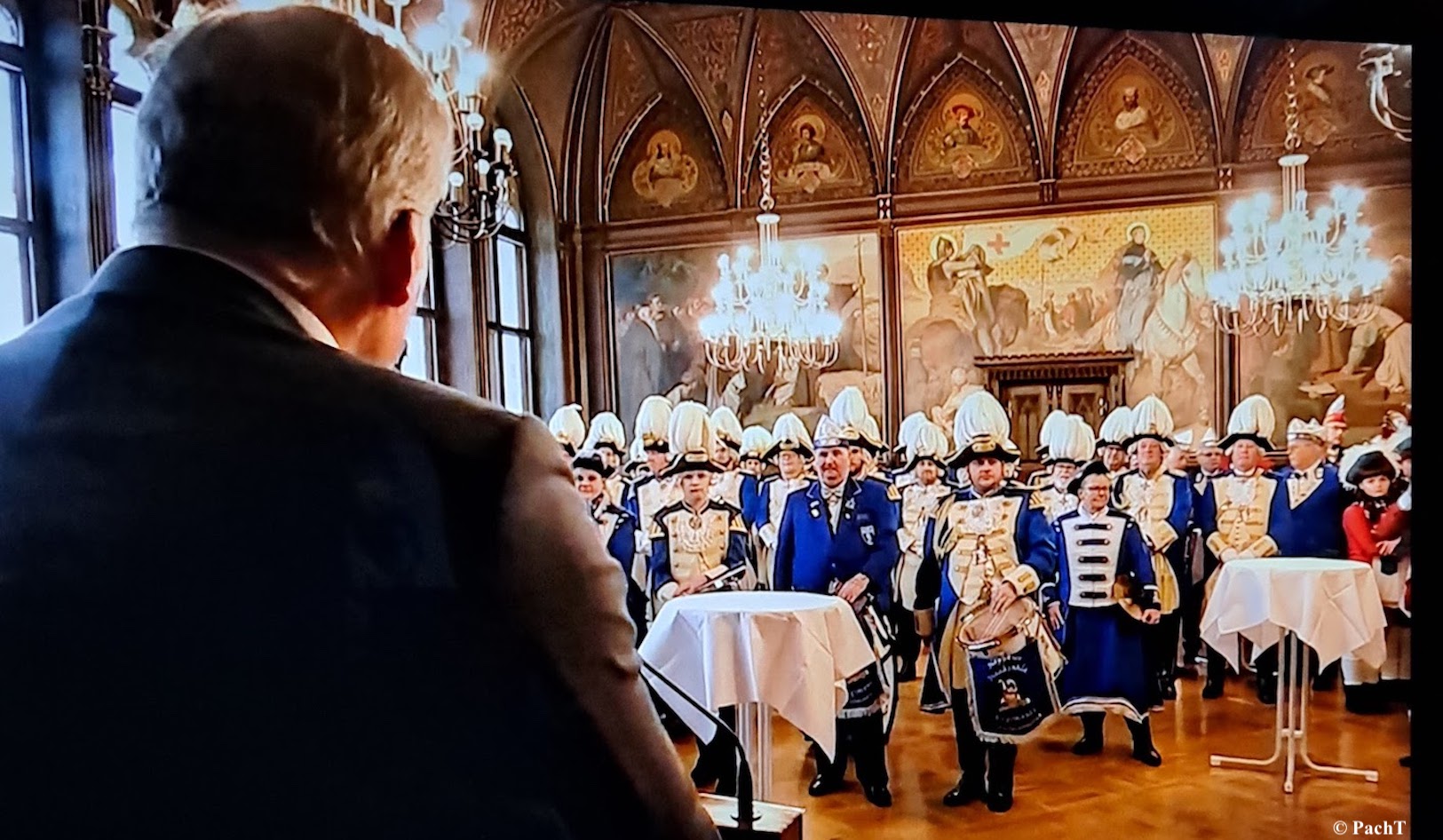 Der OB als Gast der JUBILÄUMSSITZUNG und die dem Verein angehörende EU-ABGEORDNETE zur Begrüßung auf der Bühne zu kurzen STATEMENTS. Blick auf den ELFERRAT / links der MODERATOREin TANZMARIECHEN eröffnet das PROGRAMM