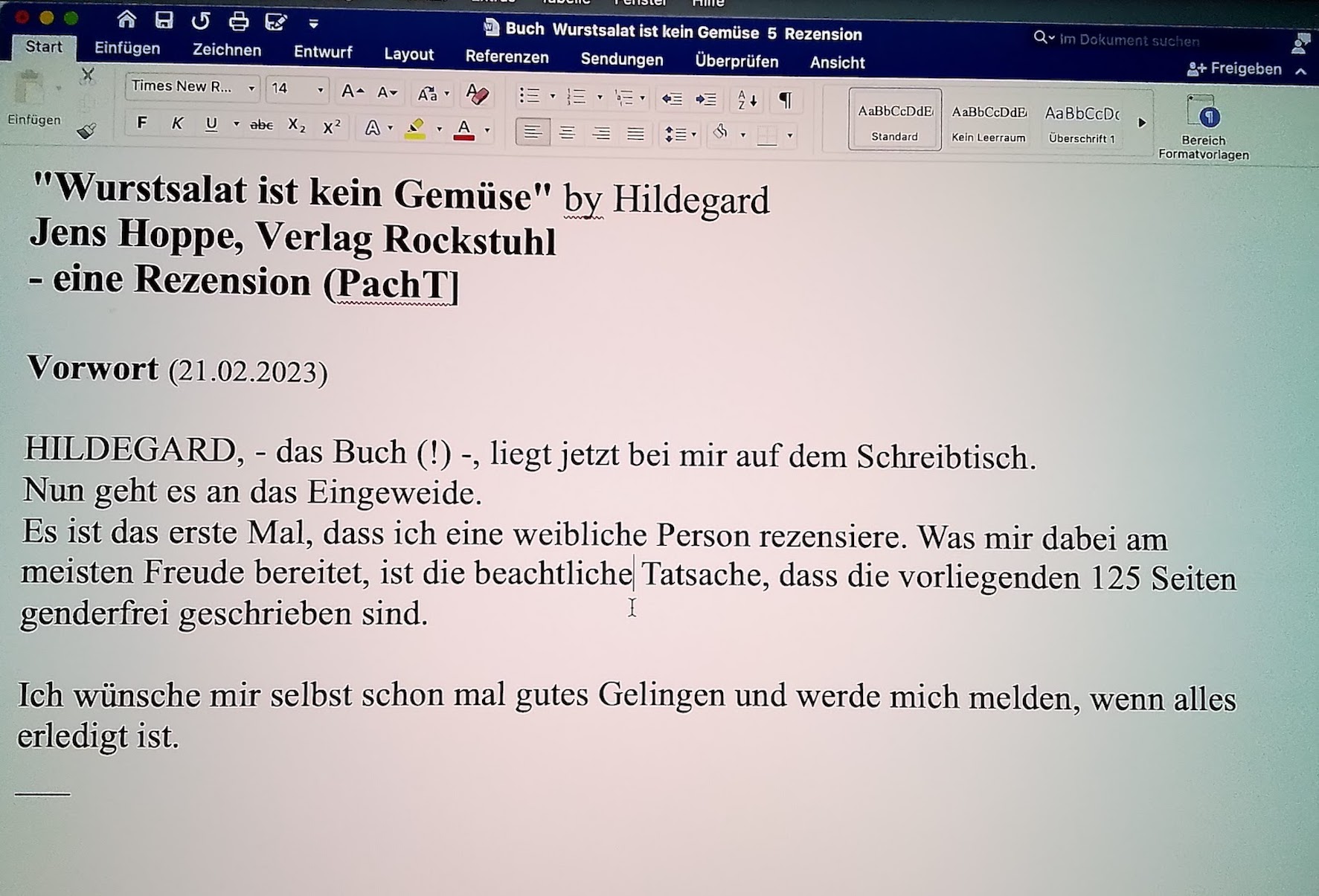 HILDEGARD, – das Buch (!) -, liegt jetzt bei mir auf dem Schreibtisch. Nun geht es an das Eingeweide. Es ist das erste Mal, dass ich eine weibliche Person rezensiere. Was mir dabei am meisten Freude bereitet, ist die beachtliche Tatsache, dass die vorliegenden 125 Seiten genderfrei geschrieben sind.