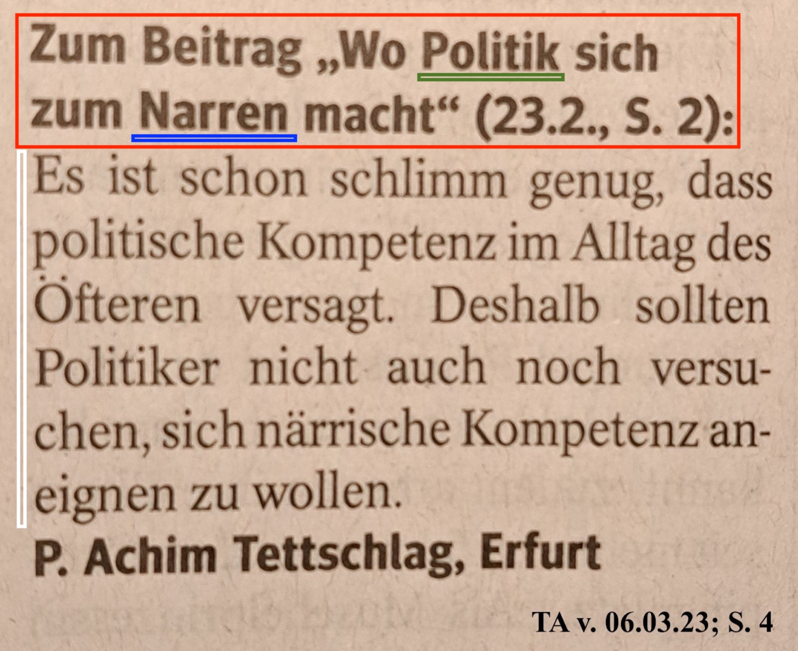 06.03.23 # Wenn ein LANDTAG zum KASPER-THEATER wird – dann ist es ernst um die DEMOKRATIE ! 6. März 20236. März 2023PachT _ Autor / Blogger Zur Erinnerung: https://einladungzupachtsblog.com/2023/02/24/24-02-23-betrachtung-im-nachhinein-zum-karneval-der-eliten-in-der-politik/ Meine AUFFASSUNG zum SACHVERHALTnunmehr doch noch veröffentlicht: IDEE @ AUSFÜHRUNG @ Text / Fotoauswahl /© PachT Klicke, um auf X zu teilen (Wird in neuem Fenster geöffnet) X Klick, um auf Facebook zu teilen (Wird in neuem Fenster geöffnet) Facebook Gefällt mir Wird geladen … Ähnliche Beiträge