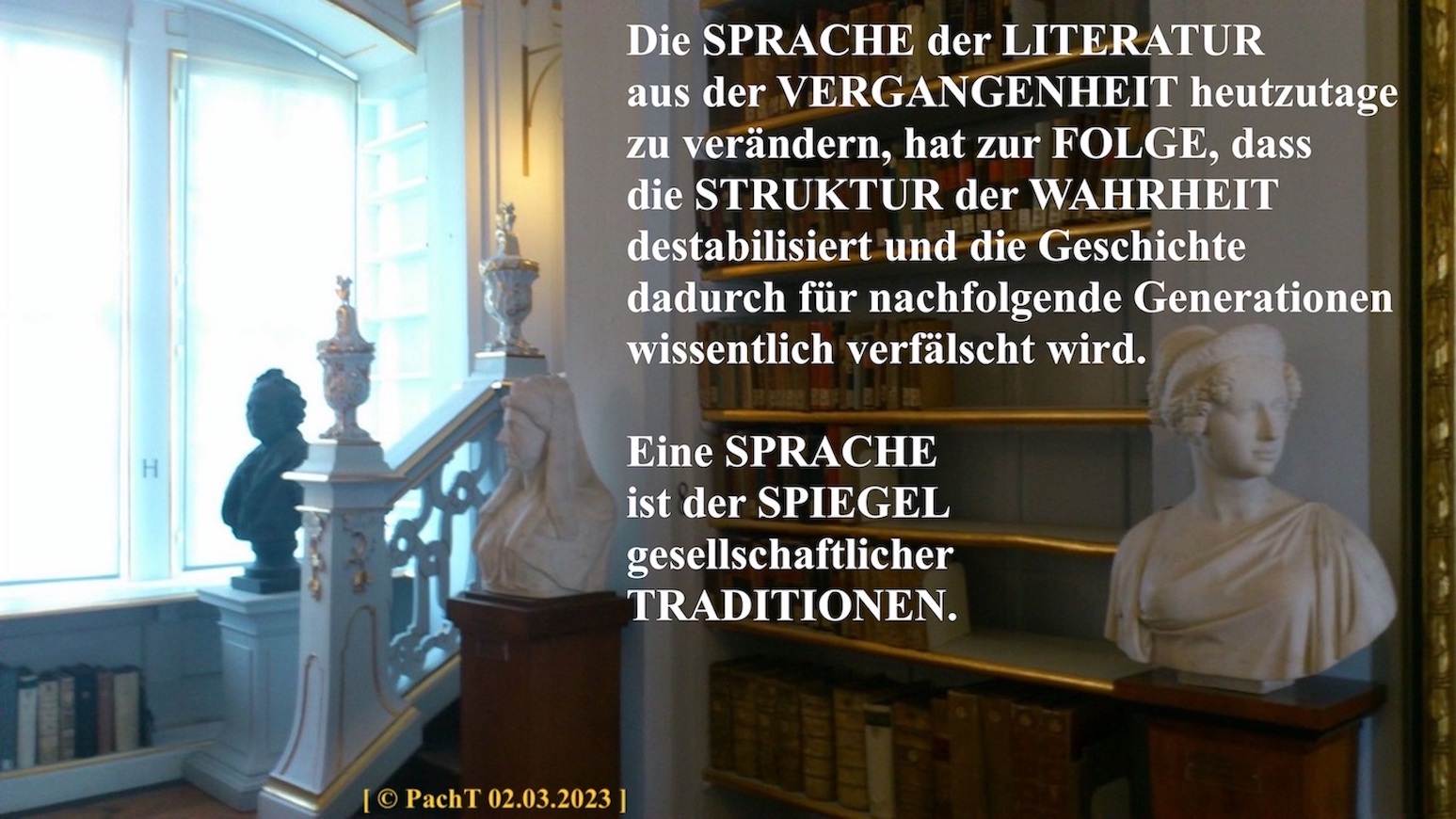 Die Sprache der Weltliteratur aus der Vergangenheit heutzutage aus ideologischen Gründen heraus verändern zu wollen, hätte meines Erachtens zur Folge, dass die Struktur der Wahrheit destabilisiert und die Geschichte dadurch für nachfolgende Generationen wissentlich verfälscht wird. Die Sprache ist ein Spiegel gesellschaftlicher Traditionen.