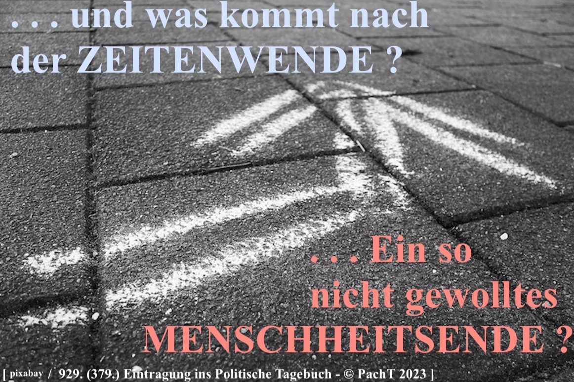 Das bisherige AUSMASS der vom deutschen BUNDESKANZLER im Februar 2022 ausgerufenen ZEITENWENDE beunruhigt mich seit Wochen. Meine GEDANKEN dazu habe ich in meiner 929. (379.) Eintragung ins Politische Tagebuch verbrieft: