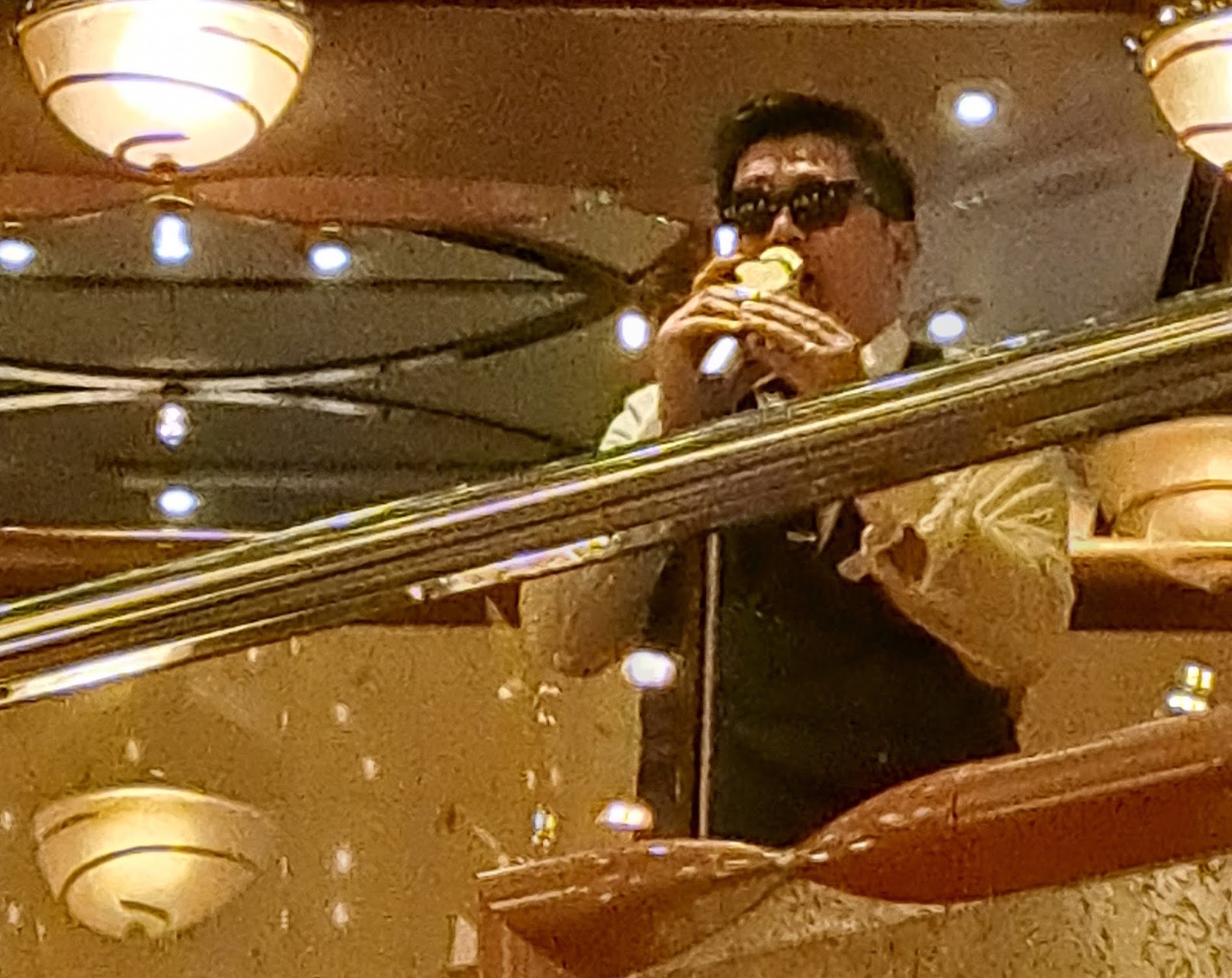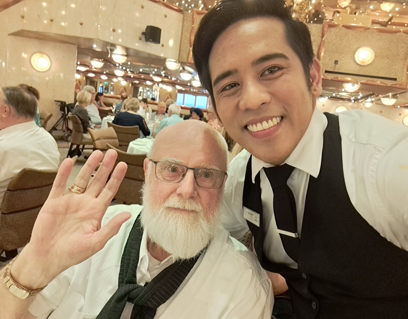 14 Mal hat uns der freundliche KELLNER, – fünf Tische gehörten zu seinem Bereich -, zwar mit anfänglichen Verständigungsproblemen, immer freundlich und zuvorkommend bedient … Ein angemessenes Trinkgeld in EURO-Währung haben wir ihm zukommenlassen. Übrigens mit unserem KABINENSTEWART waren wir gleichermaßen zufrieden und anerkennend.