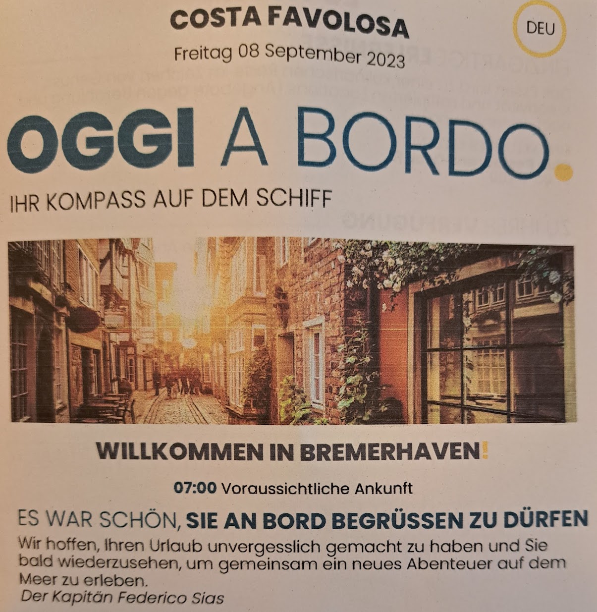Ein erstes FAZIT: > Es war für uns insgesamt eine erlebnis– und erinnerungswürdige REISE, a b e r nichts ist so gewesen, wie es früher, – wiederholt erlebt -, war. * > Das PREIS/LEISTUNGSVERHÄLTNIS hat sich negativ entwickelt: Allein die Feststellung, dass zu den teurer gewordenen LANDGÄNGEN nicht in jedem Falle eine deutschsprachige REISEFÜHRUNG zur Verfügung stand, ist unangemessen. Wenn das nicht möglich ist, darf man, – selbst verklauseliert -, solche Landausflüge zum Ärger der gemeldeten Teilnehmer nicht anbieten. * > Zuwider allen digitalen WETTERPROGNOSEN hatten wir in diesen Tagen ausgesprochen herrliches Wetter, so dass unsere Koffer durchaus hätten leichter gewesen sein können. * > Positiv ist hervorzuheben, dass für die zahlreichen Passagiere mit BEHINDERUNGEN jedweder Art stets hilfsreiches Personal zugegen war. > DANKE < ! * > An den BÜFETTS gab es keine SELBSTBEDIENUNG mehr … Das ist meines Erachtens gut so, aber wiederholt war zu erleben, wie lustlos einem das Gewünschte auf den Teller “geklatscht“ wurde … Denn mal GUTEN APPETIT !