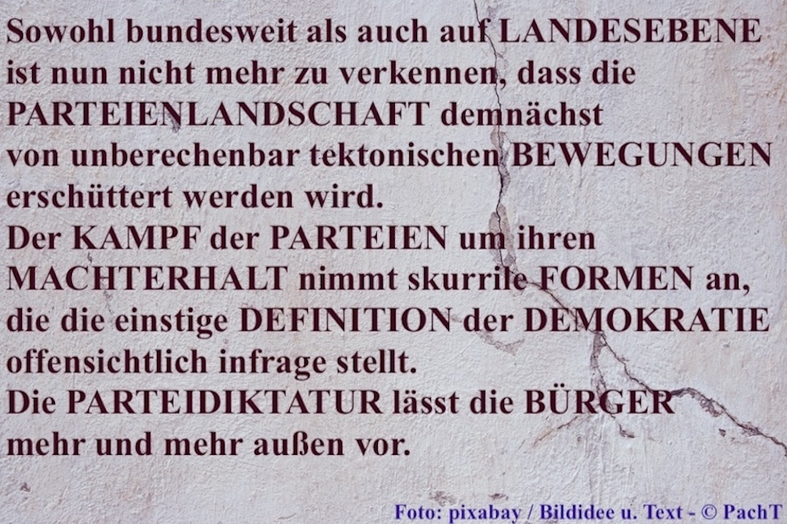 Sowohl bundesweit als auch auf LANDESEBENE ist nun nicht mehr zu verkennen, dass die die PARTEIENLANDSCHAFT demnächst von unberechenbar tektonischen BEWEGUNGEN erschüttert werden wird. Der KAMPF der PARTEIEN um ihren MACHTERHALT nimmt skurrile FORMEN an, die die einstige DEFINITION der DEMOKRATIE offensichtlich infrage stellt. Die PARTEIDIKTATUR lässt die BÜRGER mehr und mehr außen vor. ___ © PachT ___