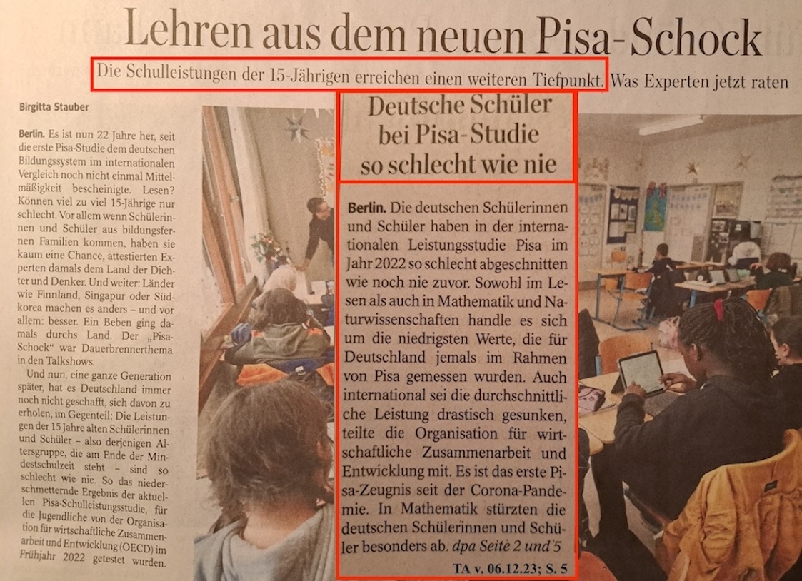 Nun ist sie veröffentlicht, die P I S A – STUDIE; ein beschämendes ZEUGNIS für unser LAND, für meine HEIMAT ! * Wenn man nunmehr die KOMMENTARE in FUNK und FERNSEHEN sowie die gestammelten STATEMENTS der dafür unstrittig politisch VERANTWORTLICHEN hört, wird offenbar, wie unfähig doch mehrheitlich politisch ungebildete POLITIKER sind, die nur noch an ihrem persönlichen VORTEIL interessiert sind. Aber ungebildete WÄHLER sind keine politischen STÖRFAKTOREN!